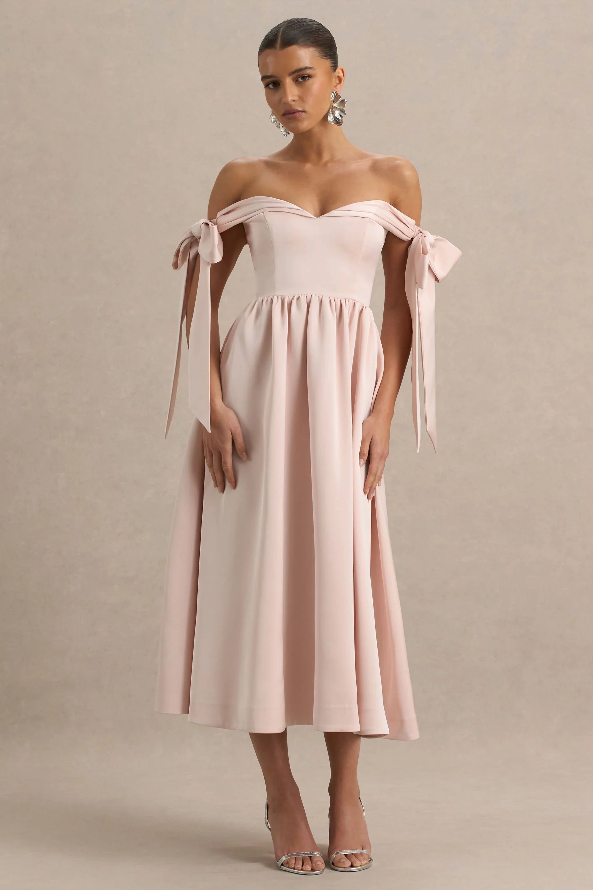 Make an entrance in Agafay, your ultimate occasion wear piece. Crafted from our premium satin, this midi dress stuns in a romantic rose pink shade made for unforgettable moments. The bardot neckline channels timeless elegance, while the bow sleeve details add the perfect flirty finish. Chic, graceful, and ready for every special occasion on your calendar.