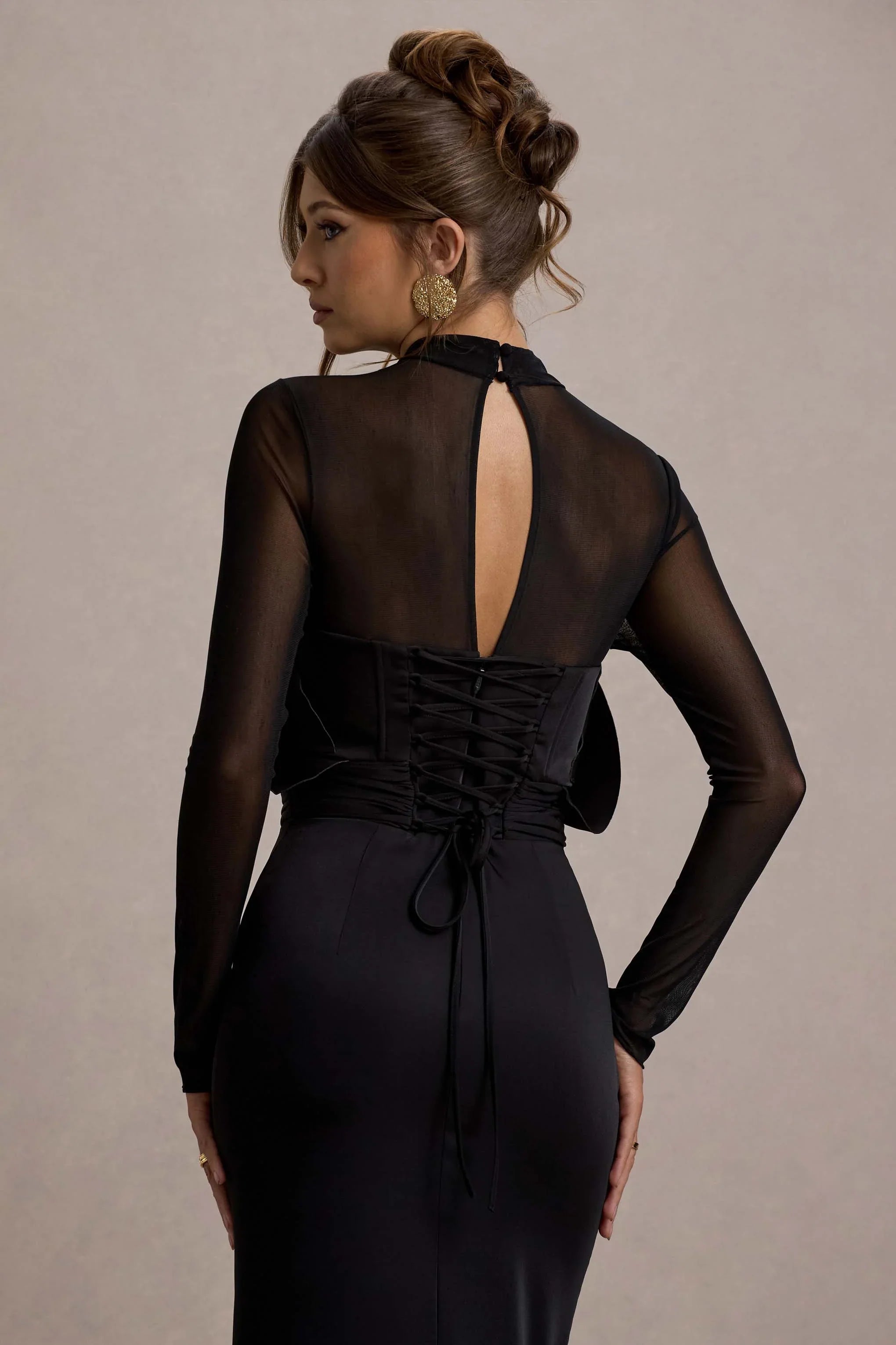 Dial up the drama this event season in Alder, our show-stopping maxi. Designed in a midnight black shade of premium crepe, this floor-sweeper boasts a high neckline, long sheer sleeves and ruffled neckline. Complete with a waist-cinching lace-up back and high-leg split, whats not to adore with Alder?
