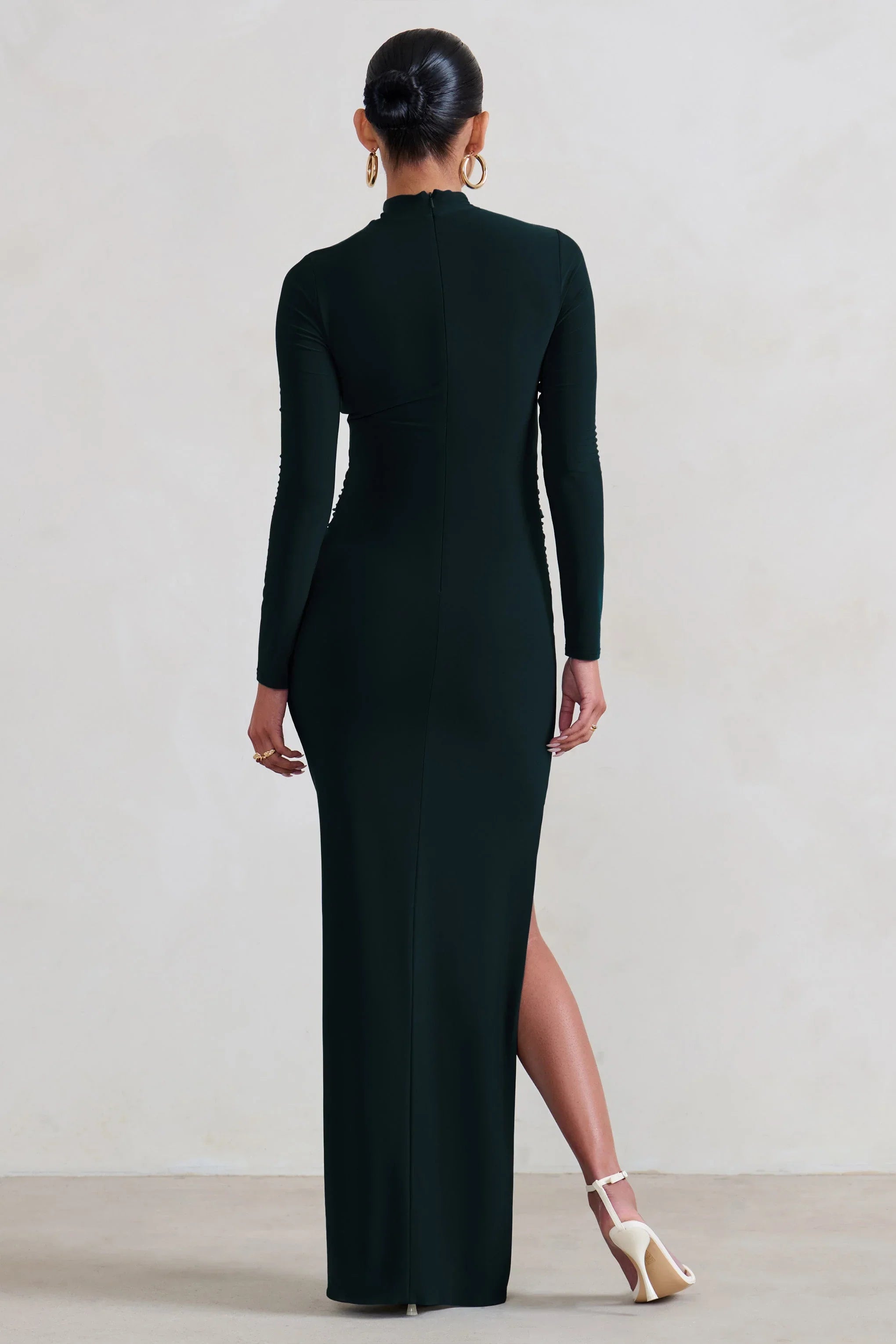 Sculpt your gorgeous growing silhouette in our latest maternity maxi dress, Alejandra. The perfect bodycon for that upcoming baby shower, this black dress is designed in premium stretch jersey with long sleeves, a high neckline and a striking side split.