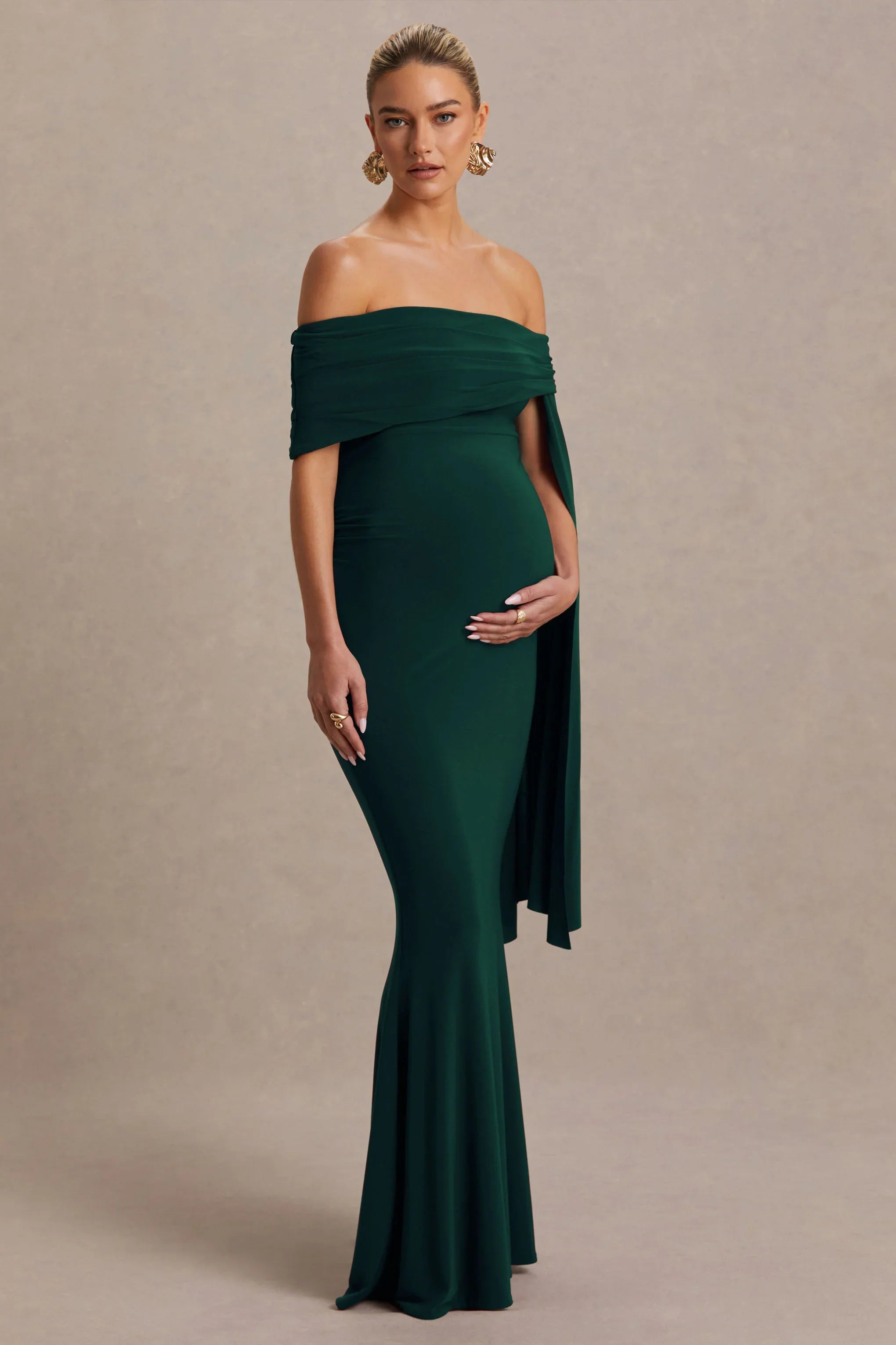 Radiate elegance in our latest maxi Aquila. This maxi is curated in a soft bottle green shade of our premium stretch jersey, designed to sculpt and flatter your curves. The bardot neckline delicately highlights your decolletage, adding a feminine feel to this gown, that cascades into a statement drape sleeve detail. Completed with flattering ruched detailing, this maxi is one that you won't be forgotten in. Pair with simple jewellery and let the dress do the talking.