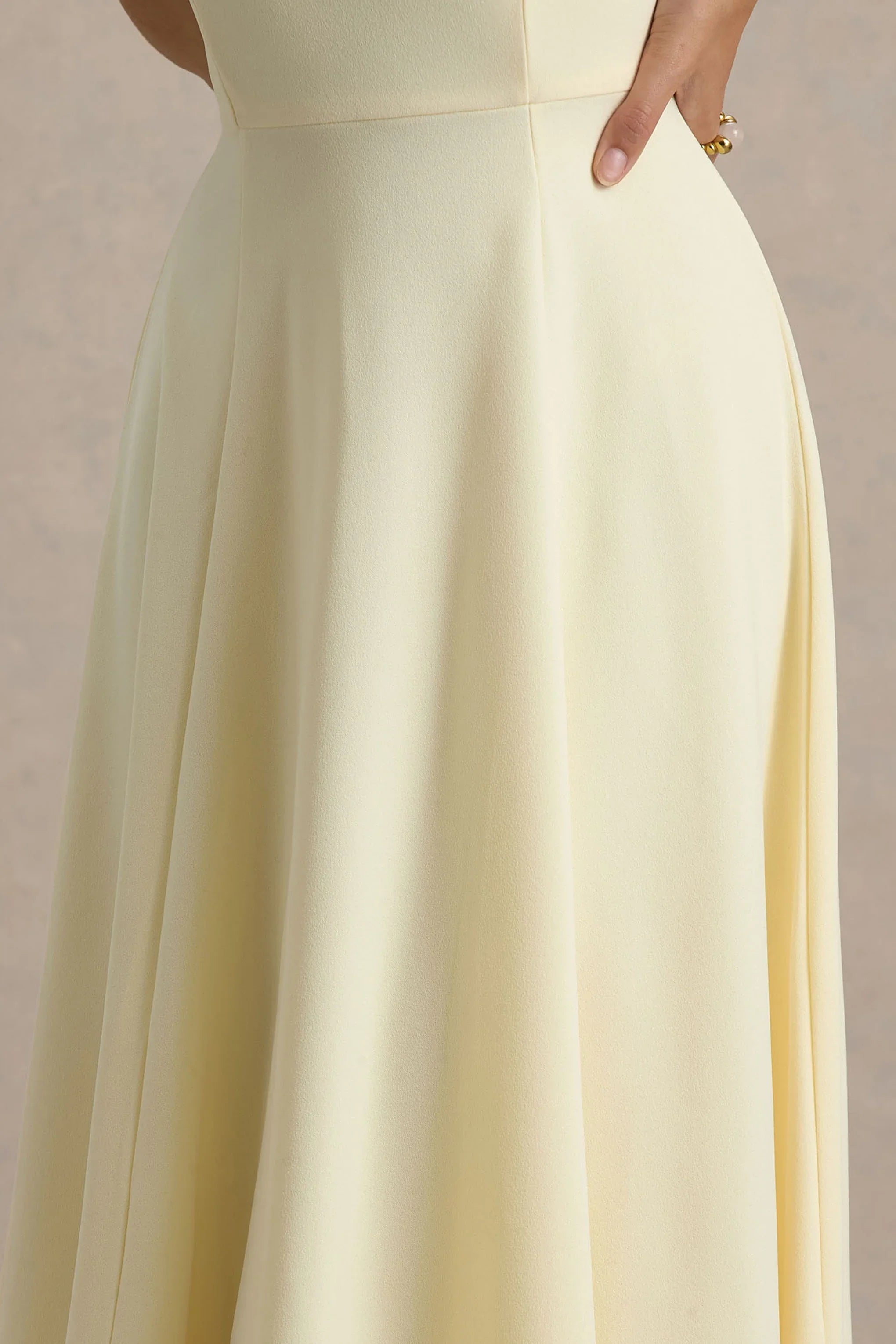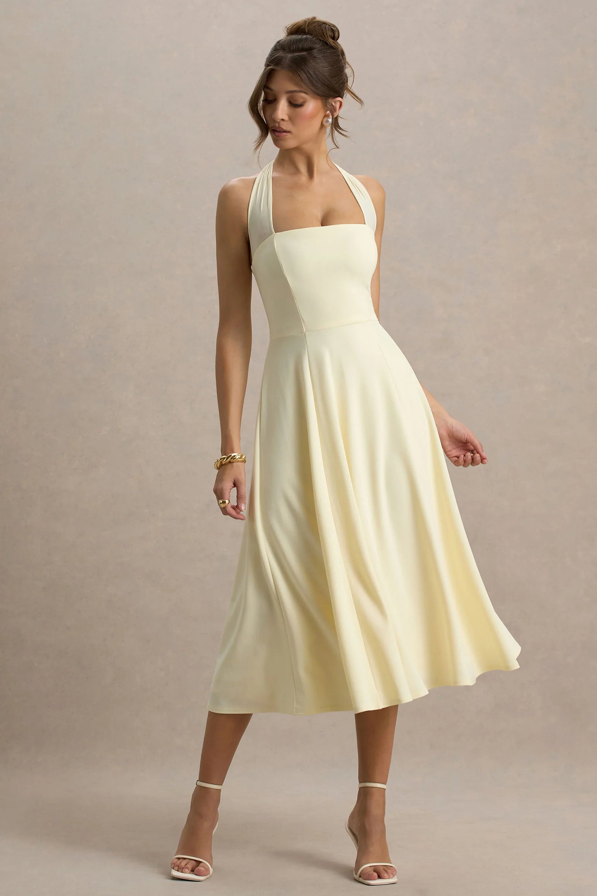 A stand-out staple, every girl needs an midi like Auburn. Expertly crafted in a premium scuba crepe, this pale lemon midi dress is detailed by a self-tie mesh halter and ethereal skater skirt.