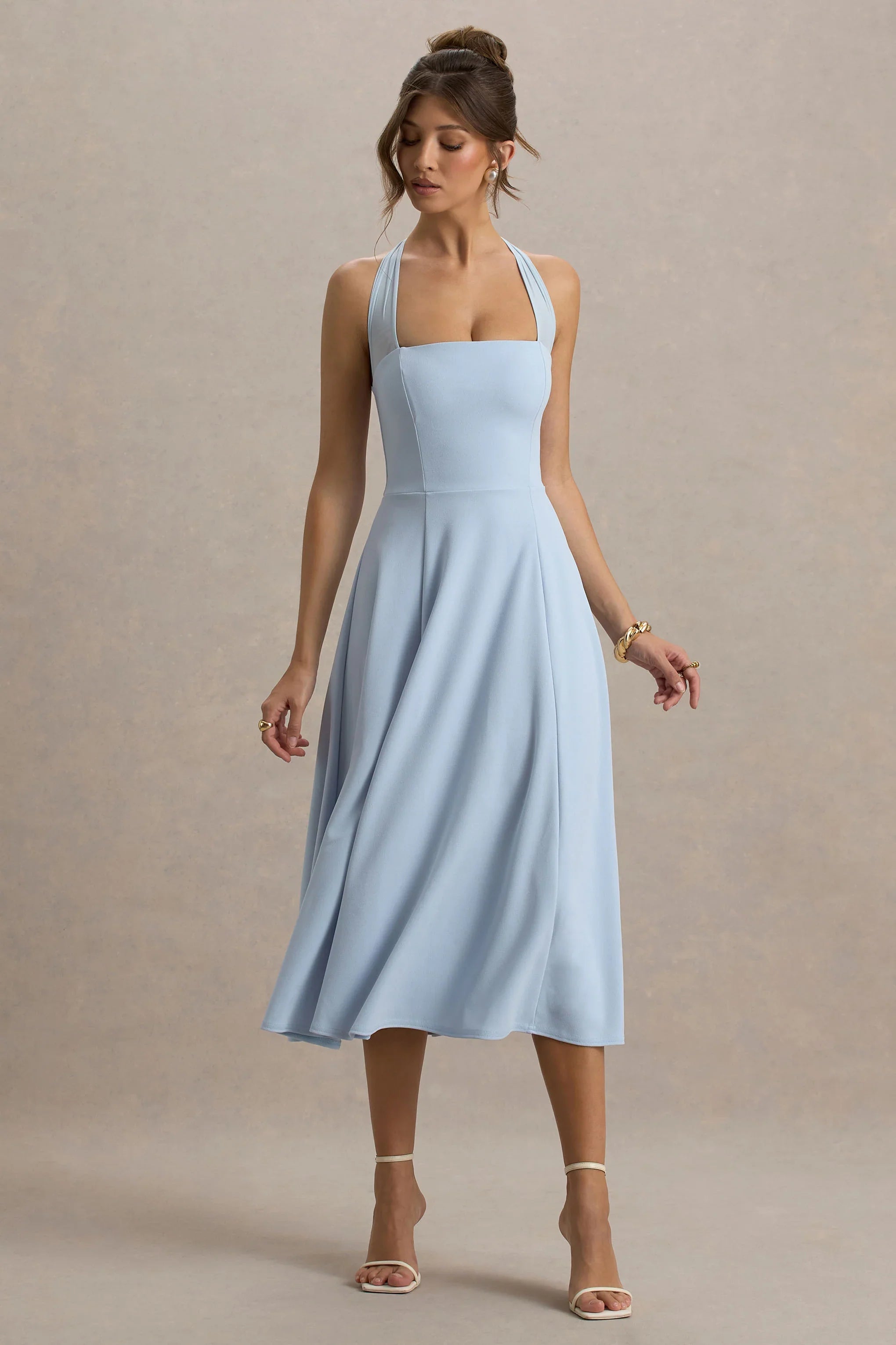 A stand-out staple, every girl needs a dress like Auburn. Expertly crafted in a premium scuba crepe, this powder blue midi dress is detailed by a self-tie mesh halter and ethereal skater skirt.