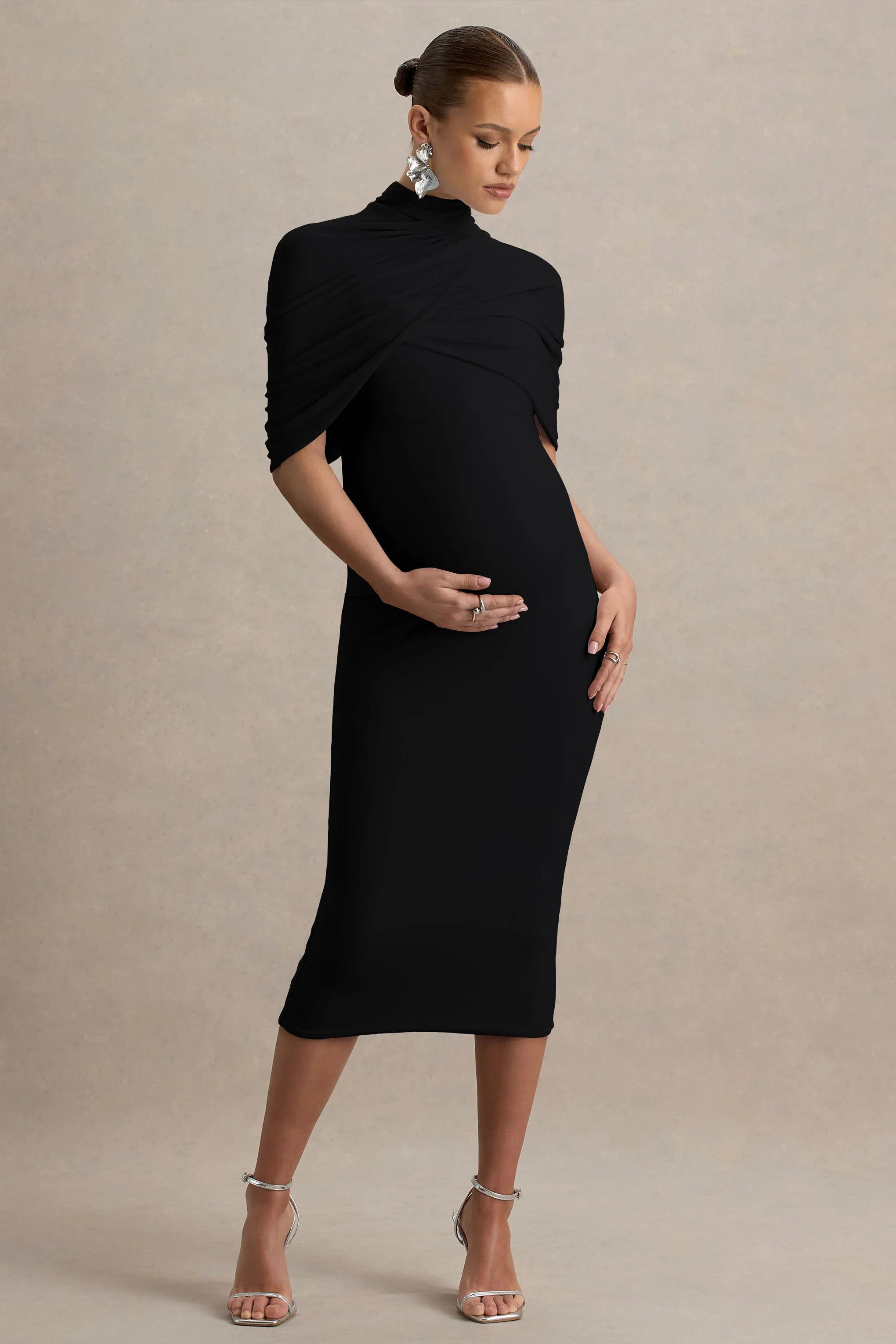 Exude effortless elegance and grace in Augustina. Crafted from our premium stretch jersey, to sculpt your silhouette, this black midi dress is the perfect statement maker for your next special occasion. Designed with a chic high neck and cape sleeves, this piece is the epitome of sophistication. Finished with expertly placed ruched detailing to flatter your figure, in Augustina you will feel as good as you look.