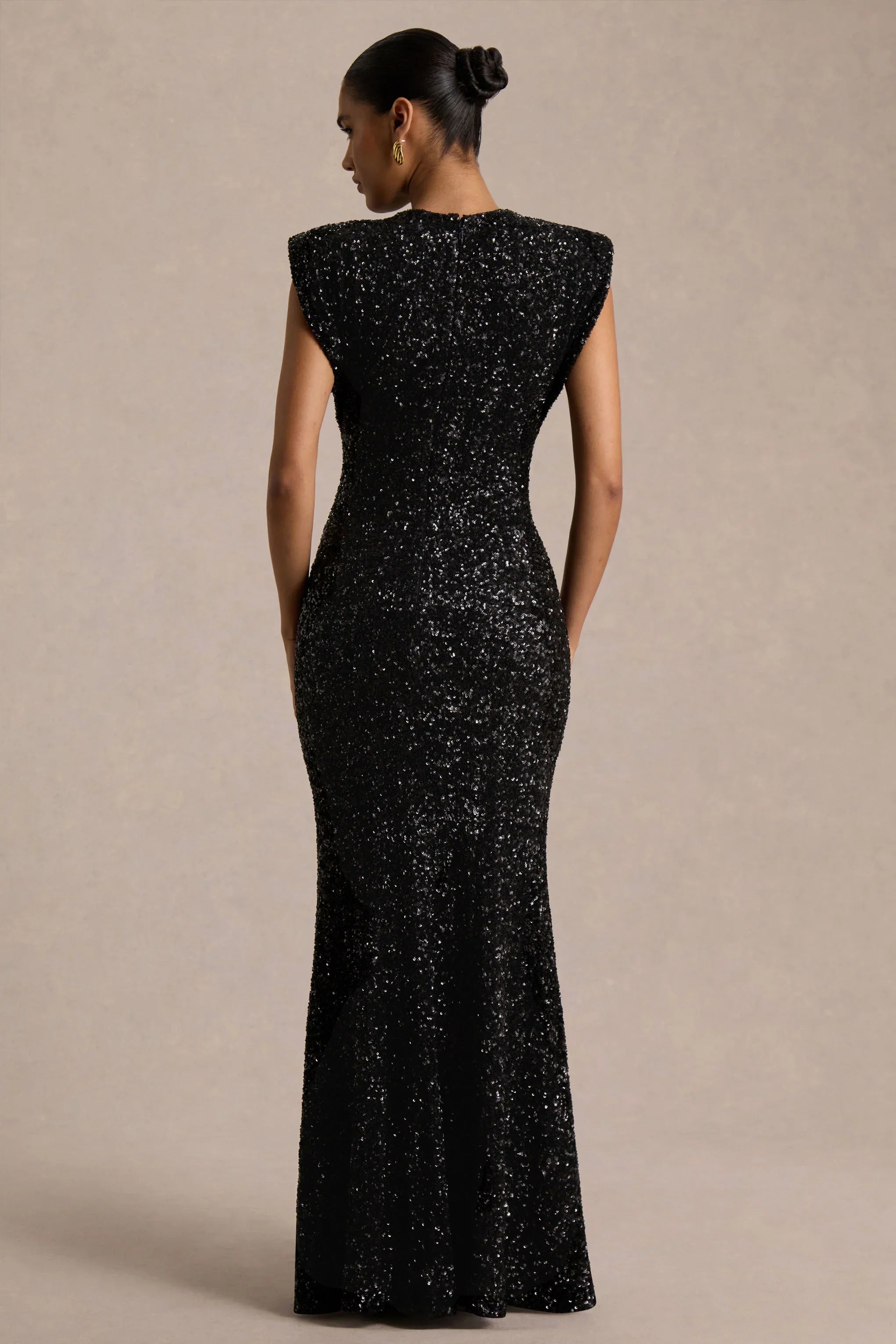 Aurah is the definition of modern glamour with a bold edge. Crafted from our premium black sequin, this maxi dress glitters with every move while sculpting a sleek, flattering silhouette. The crew neckline and cap sleeves keep the look refined, while strong shoulder pads bring a striking, structured finish. Floor-sweeping in length, Aurah is made for statement moments and unforgettable nights.