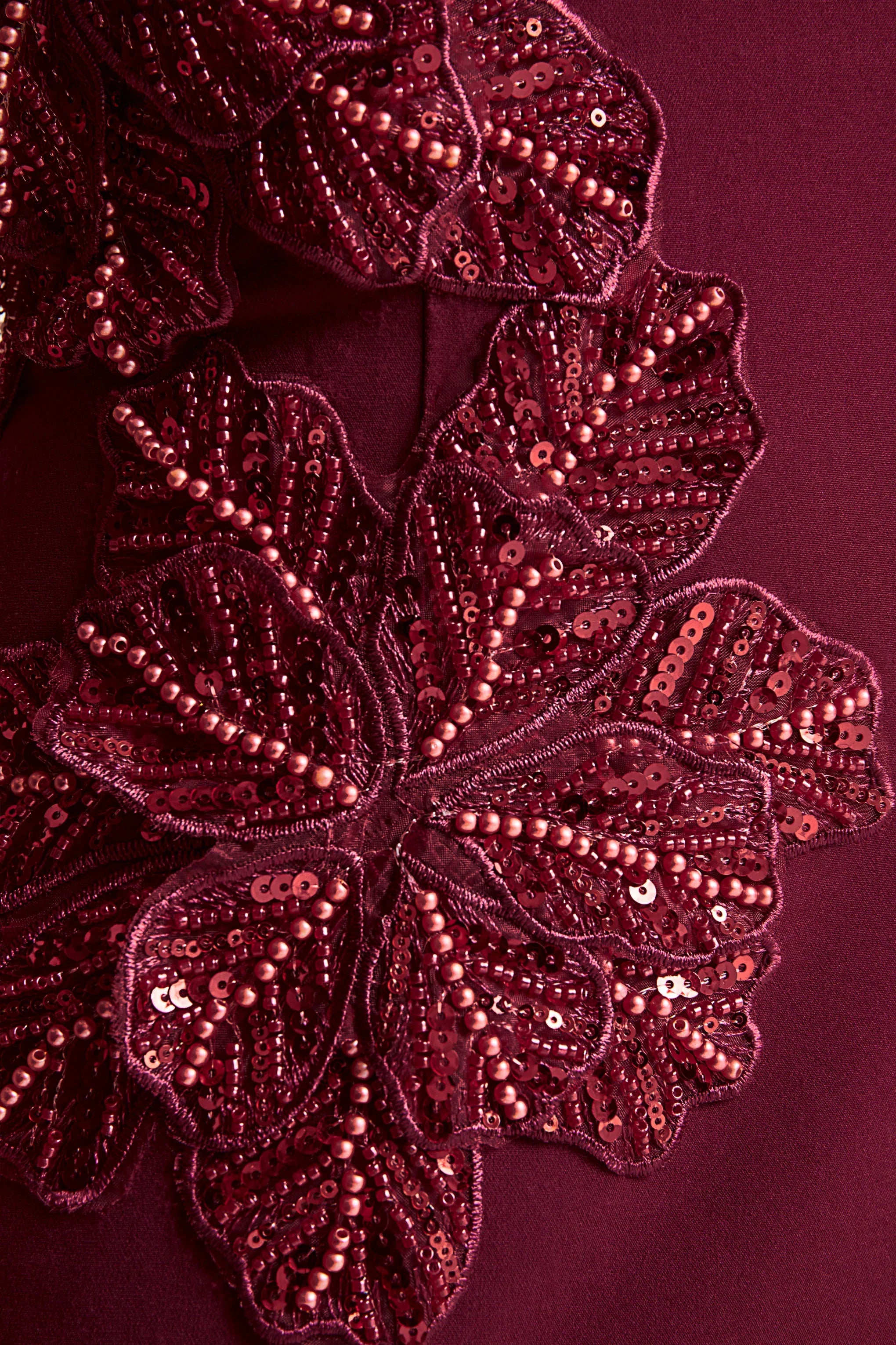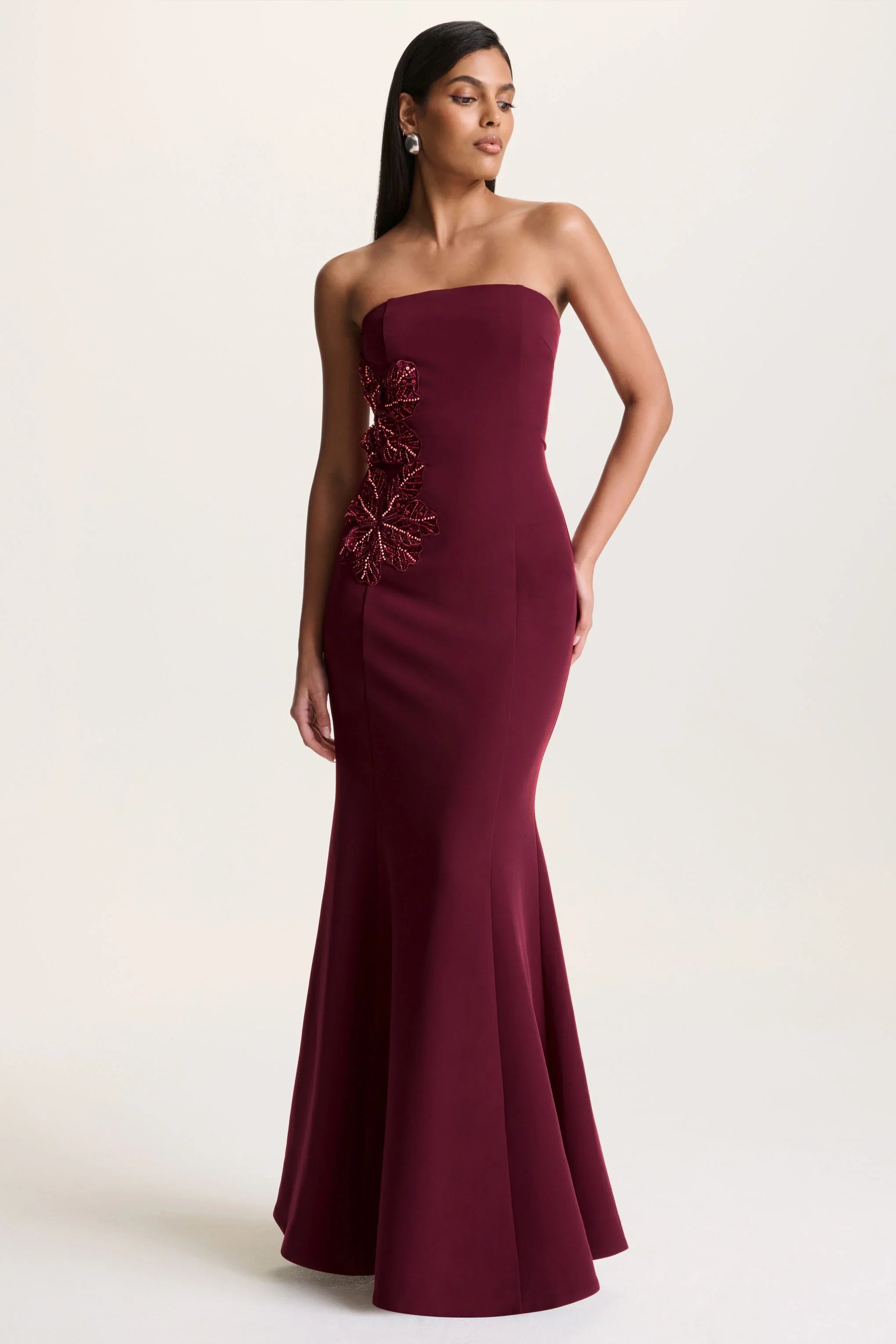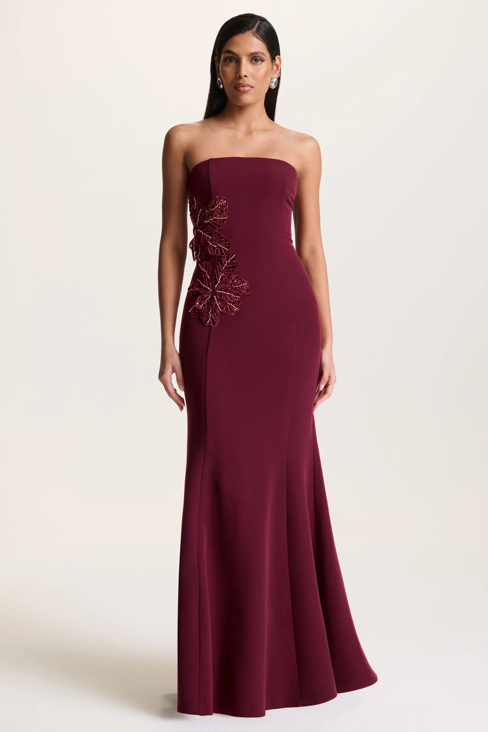 Exude timeless elegance in Aylana, where rich design meets modern sophistication. Crafted from our premium burgundy crepe, this maxi-length silhouette flatters the figure with a sleek, elongating fit. The bandeau neckline creates a striking, contemporary frame, while intricate floral applique detailing adds a touch of drama. This dress is made to turn every entrance into a statement.