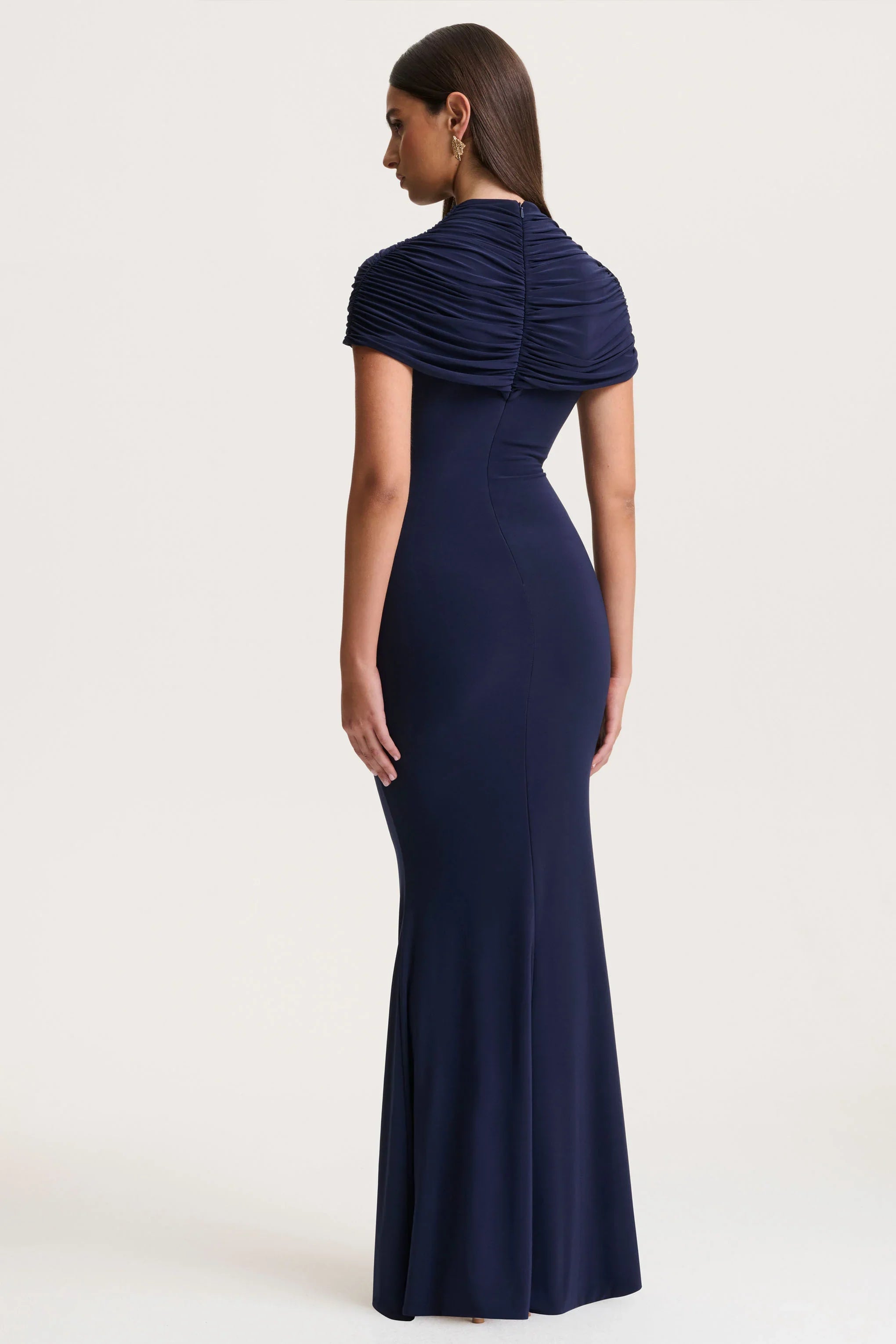 Command attention in Azaria, a gown that embodies elegance with a modern edge. Crafted in rich navy premium stretch jersey, this maxi-length silhouette is both sleek and sophisticated. Featuring a high neckline and gathered detailing that sculpts the figure beautifully, Azaria is the ultimate expression of timeless glamour. Style with sleek heels and gold accessories, for a look that's both parts understated and striking.