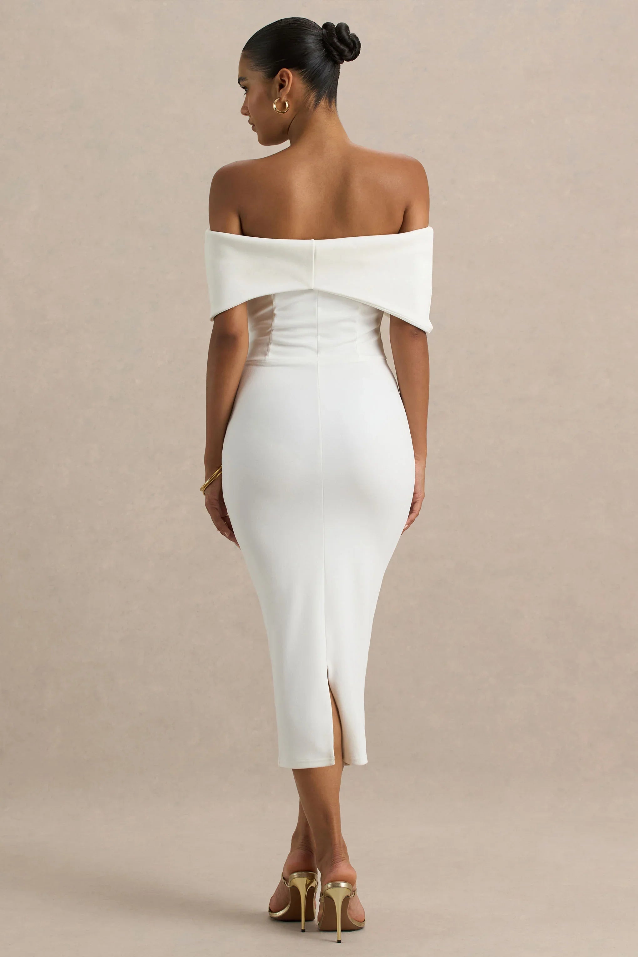The ultimate showstopper for your next special occasion, meet Bayshore. Designed in our luxurious premium scuba crepe, this sleek midi dress in a soft hue of white is the epitome of sophistication. The statement bardot neckline gracefully frames your shoulders, while the oversized bow detail adds a hint of drama for an unforgettable entrance. Perfect for spring-summer dressed up affairs paired with a glamourous up do.
