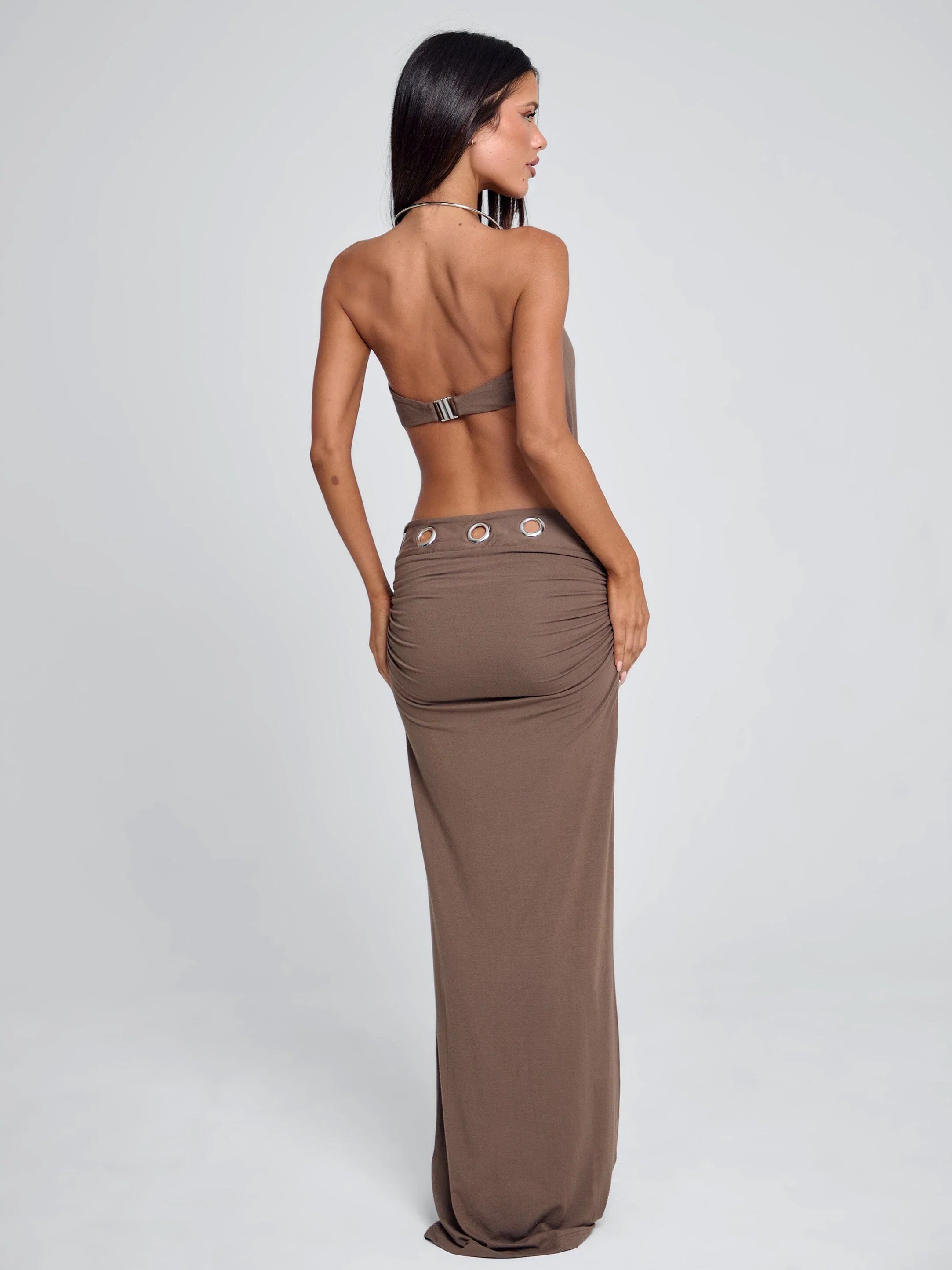 Introducing our Bellina Maxi Dress in Brown, a sultry statement piece with a modern edge.