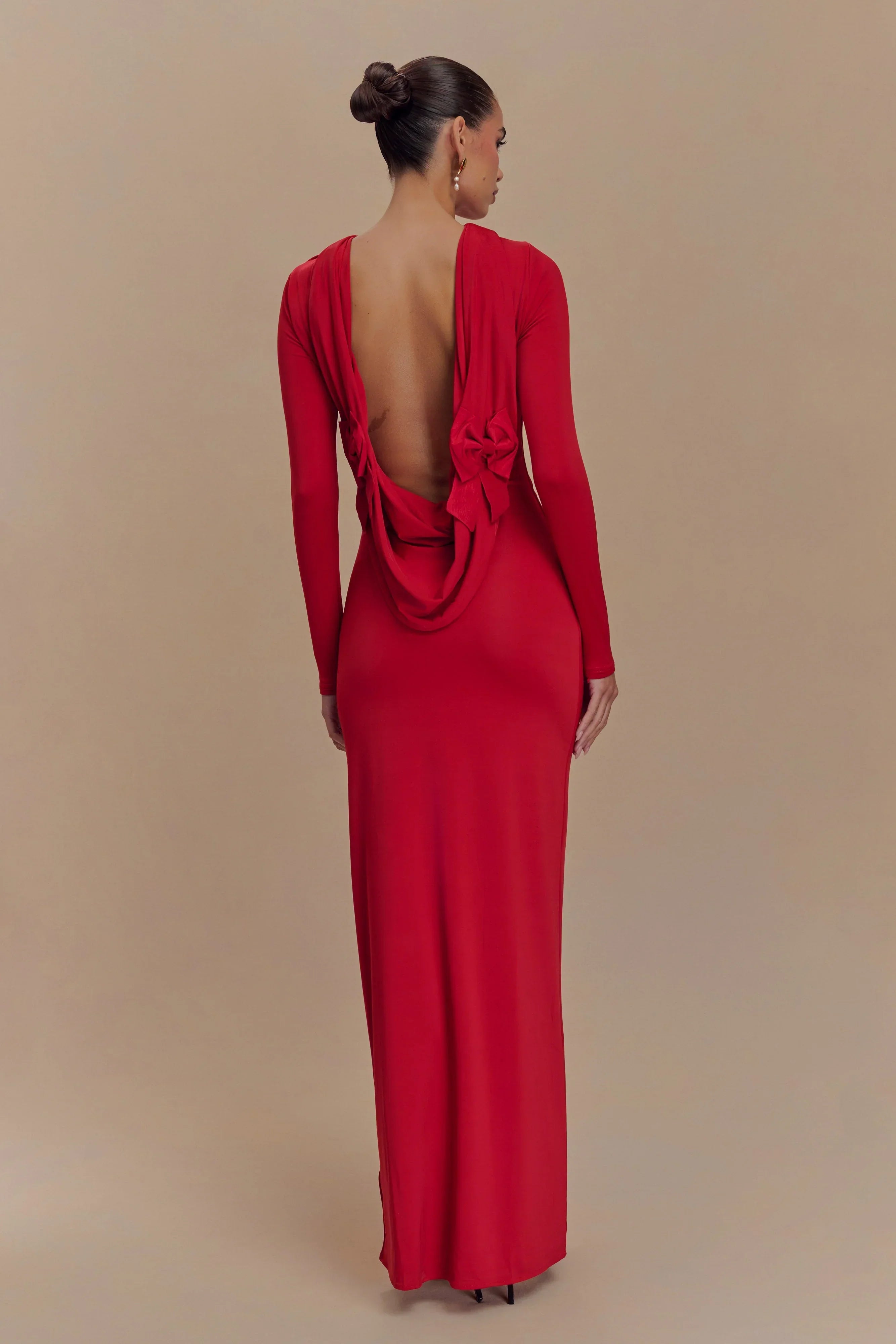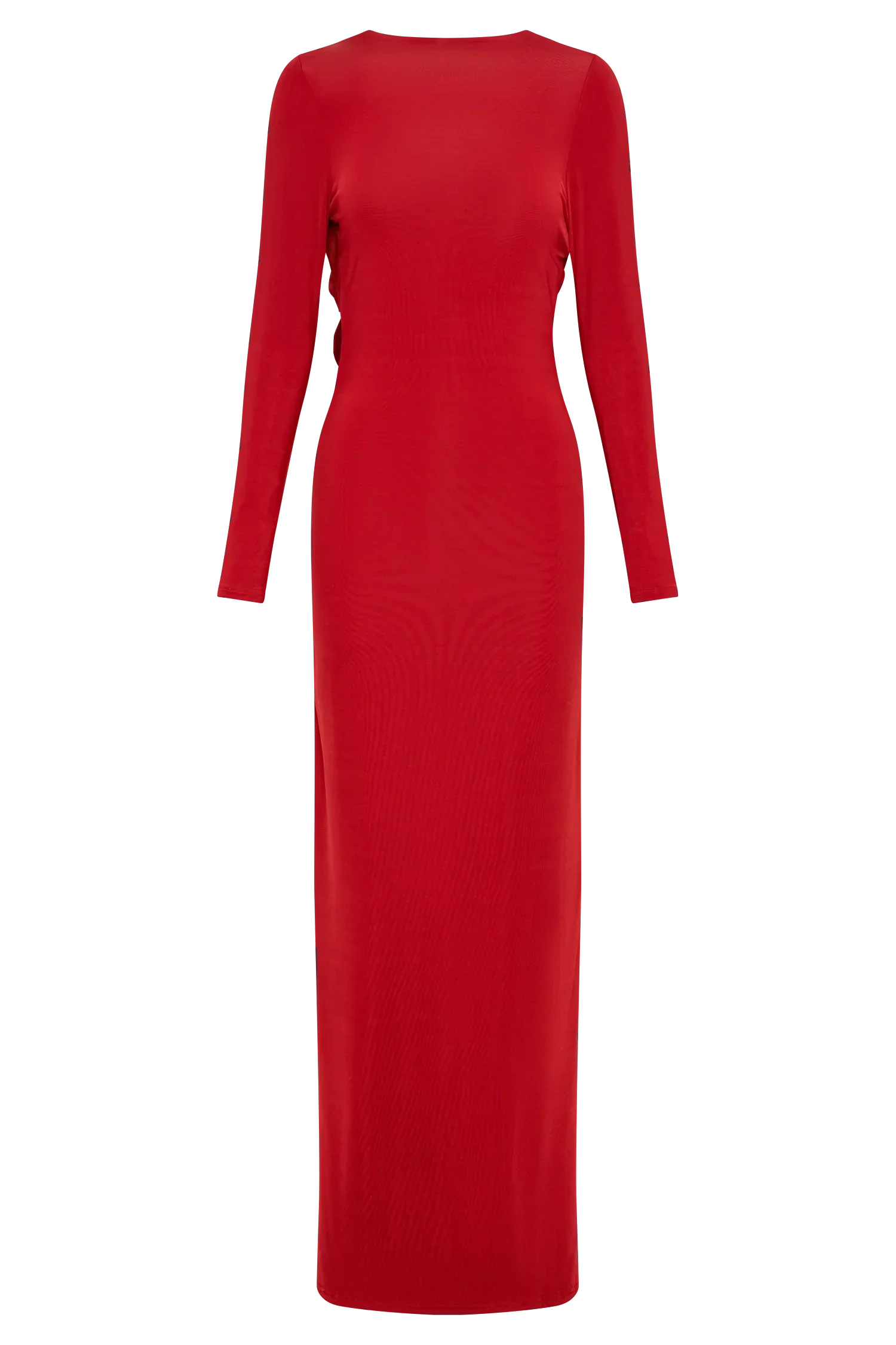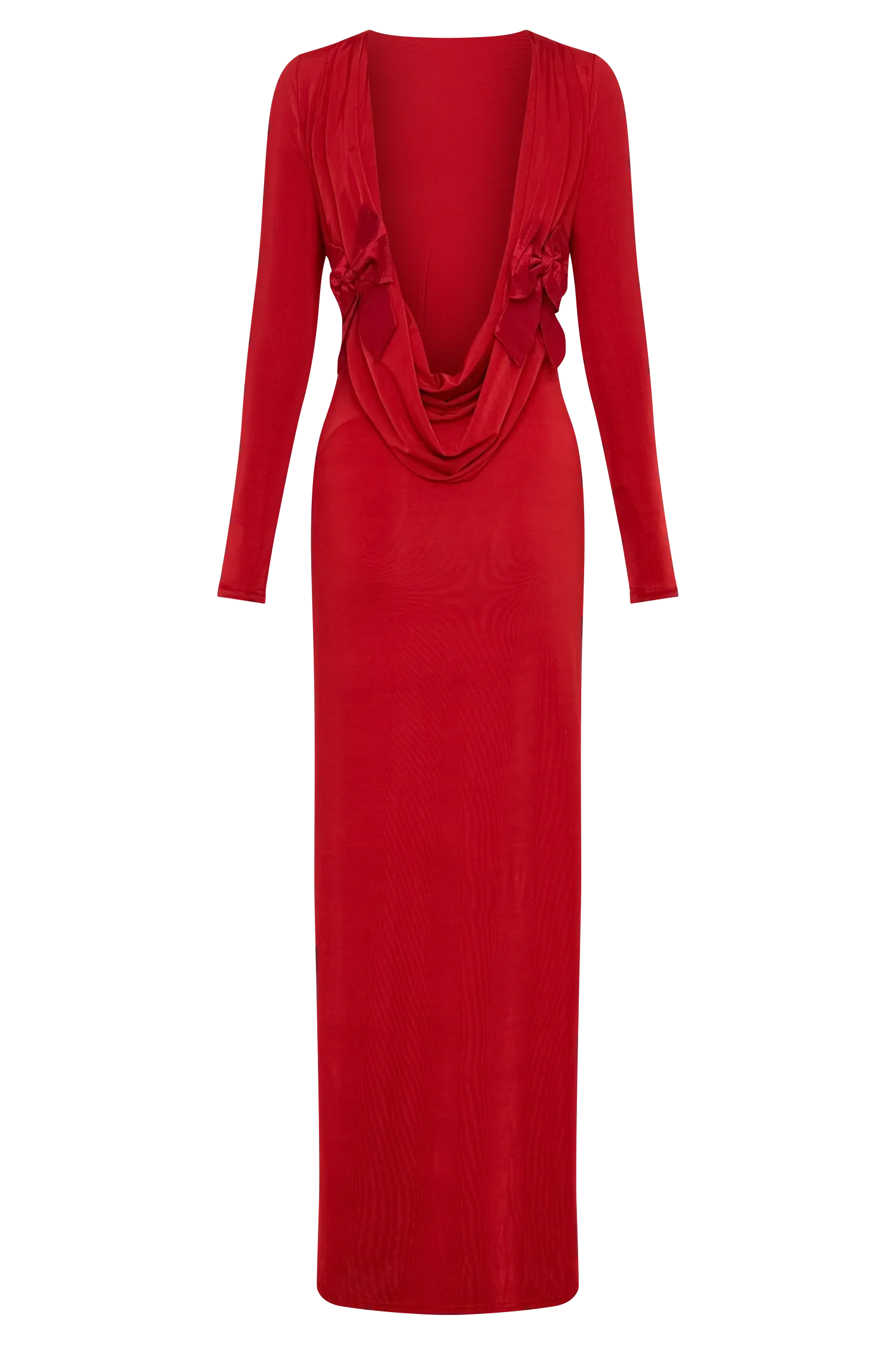 The BENNETT Slinky Long Sleeve Maxi Dress combines sultry elegance with modern sophistication. Featuring a striking low back cowl neckline with playful back bows, this bodycon dress perfectly hugs your curves, creating a figure-flattering silhouette. Crafted from stretch fabrication for a comfortable yet sculpting fit, the long sleeves add a touch of balance, while the maxi length adds a dramatic flair. Ideal for evening occasions, this dress effortlessly blends bold style with refined allure, making a memorable statement wherever you go.