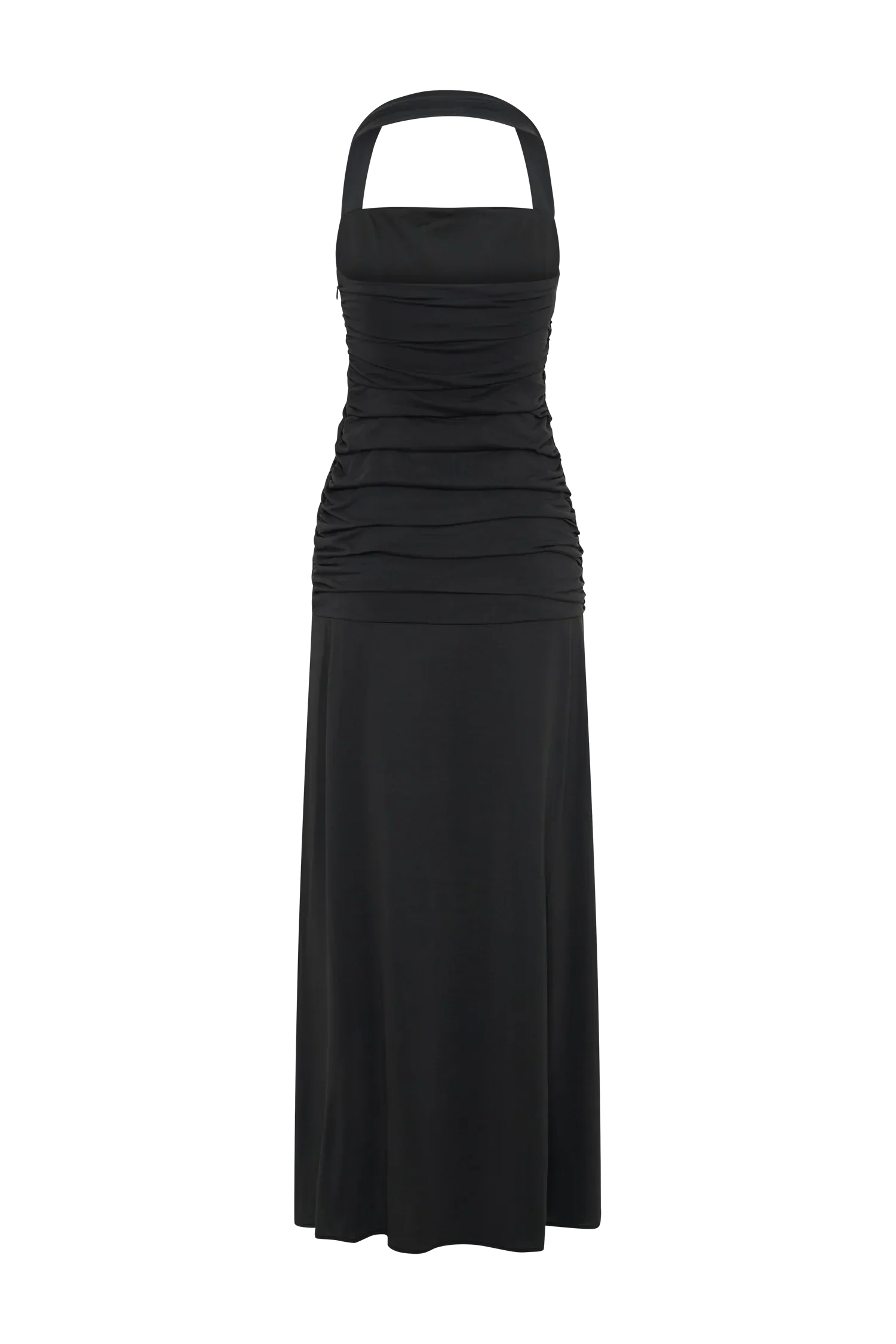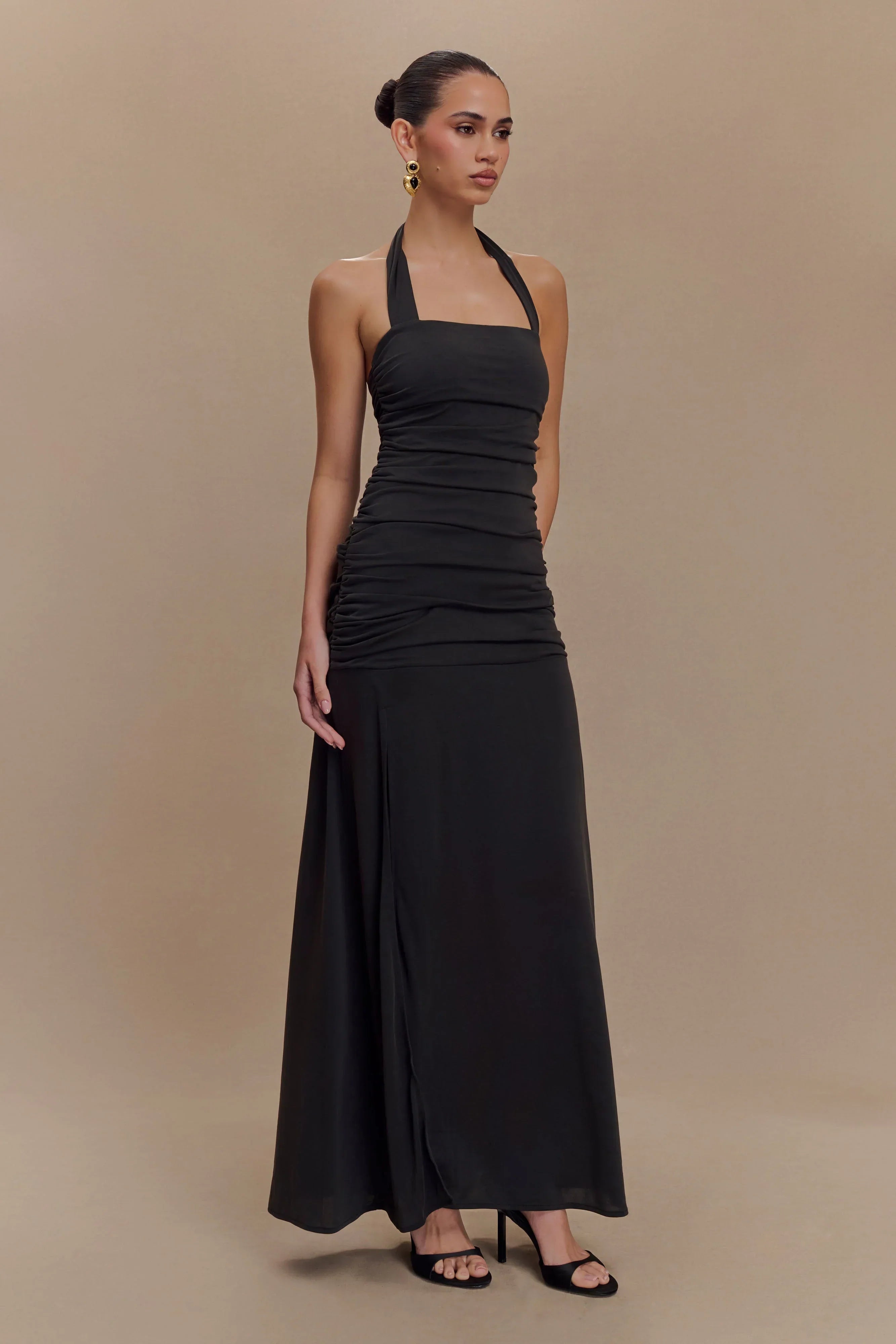 The BENTLEY Peached Jersey Halter Maxi Dress combines modern elegance with a flattering silhouette. Featuring a halter neckline and a ruched bodice that extends to the lower hip, this dress accentuates your figure while providing a comfortable fit. The flared lower skirt adds graceful movement, and the leg split enhances the dress's dramatic effect. Lined for a smooth finish, this dress reaches a maxi length, making it a perfect choice for formal events or elegant evening outings.