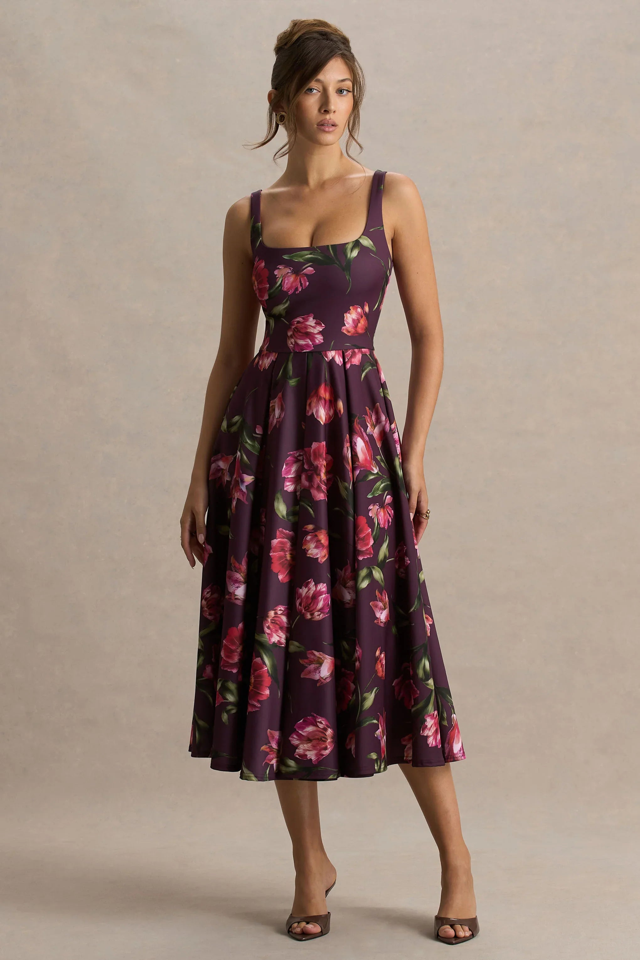 Introducing the perfect timeless addition to your wardrobe, Berta. Crafted in our premium scuba fabric, this midi dress is designed in a burgundy floral print adorned with bold navy polka dots, giving vintage glamour a modern twist. Featuring a flattering square neckline and cami straps, this piece is as feminine as it is striking. The A-line silhouette skims the body beautifully, flowing into a skirt that moves with grace. Perfect for elegant garden parties or statement daytime soirées.