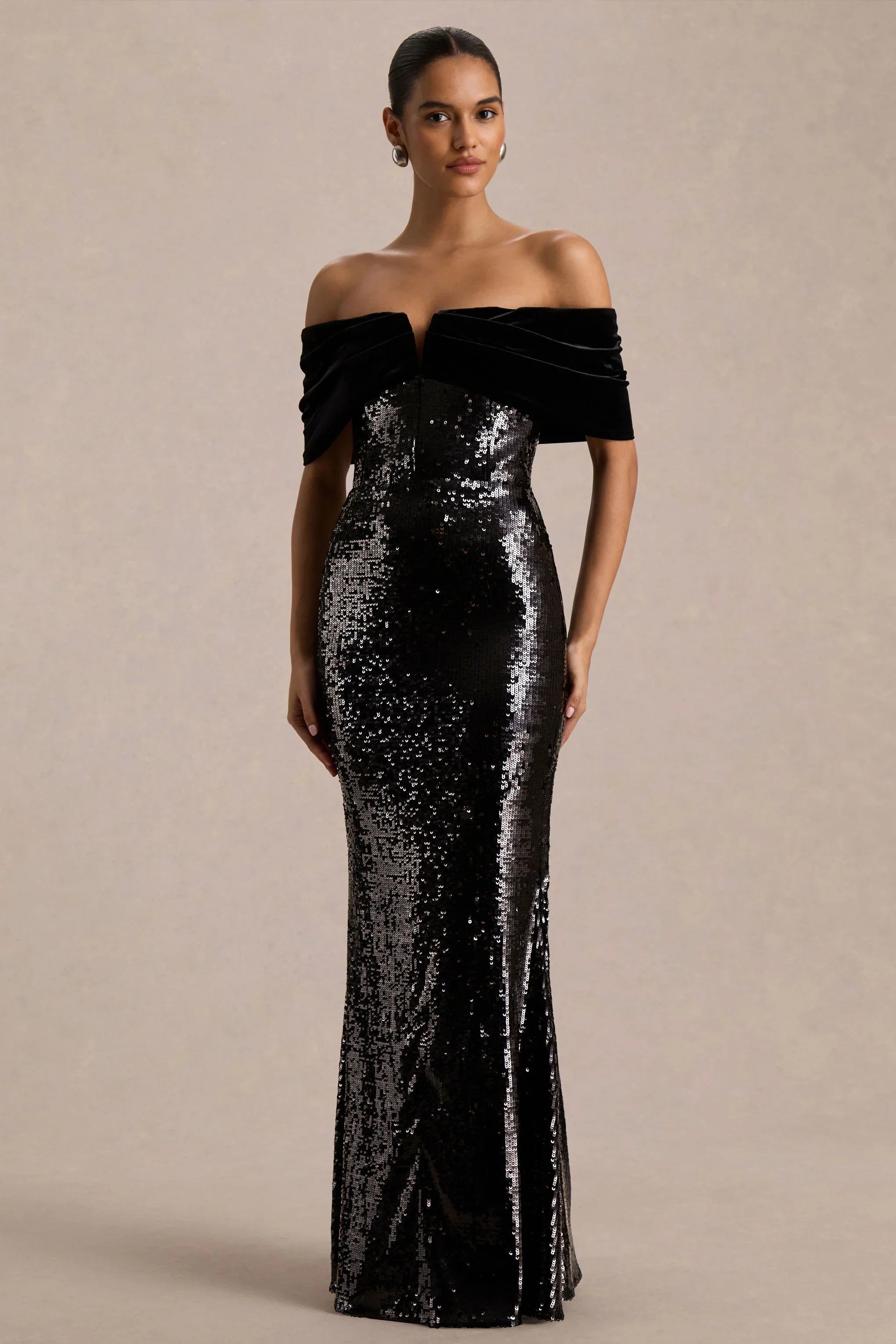 Say hello to Bex, the maxi dress that was made to shine. Crafted from premium black sequin fabric, its floor-length silhouette hugs the figure for a flawless, sculpted fit. The bardot neckline paired with a wired V detail creates a striking, alluring shape that exudes confidence. Bex is your go-to for show-stopping evenings and red-carpet moments.
