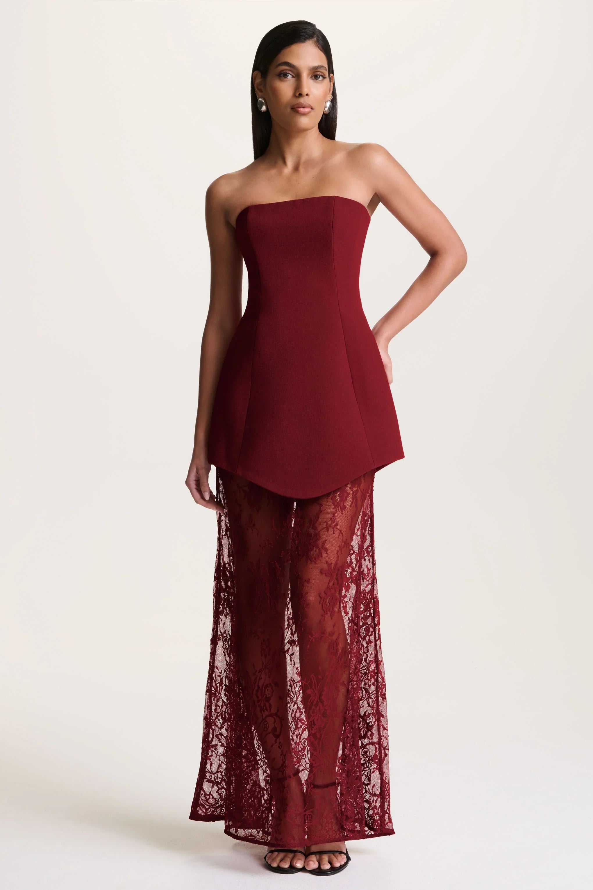Brandi blends alluring elegance with refined couture detailing. Crafted from our premium burgundy crepe and delicate lace, this maxi-length design creates a striking contrast of structure and softness. The bandeau neckline offers a clean, frame, while the corset bodice sculpts the silhouette with ease. A sheer lace skirt adds a touch of ethereal drama, revealing graceful movement with every step. Designed for evenings that demand bold glamour and elevated femininity, Brandi is a statement of irresistible sophistication.