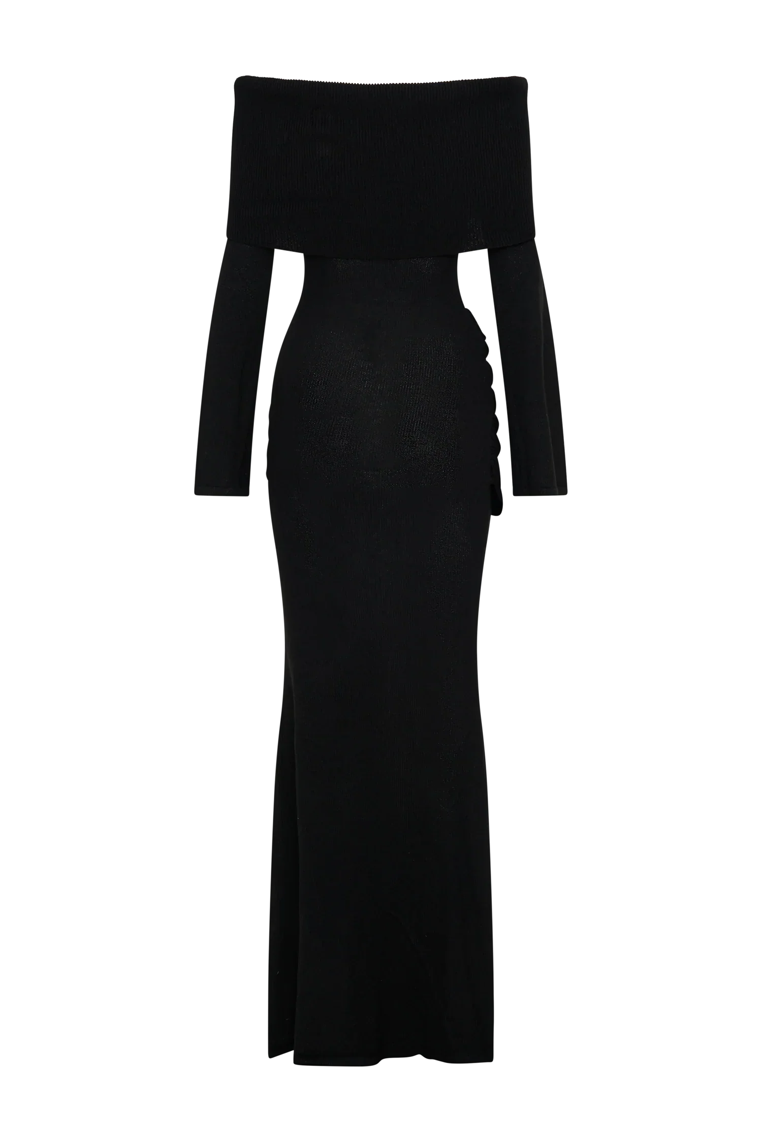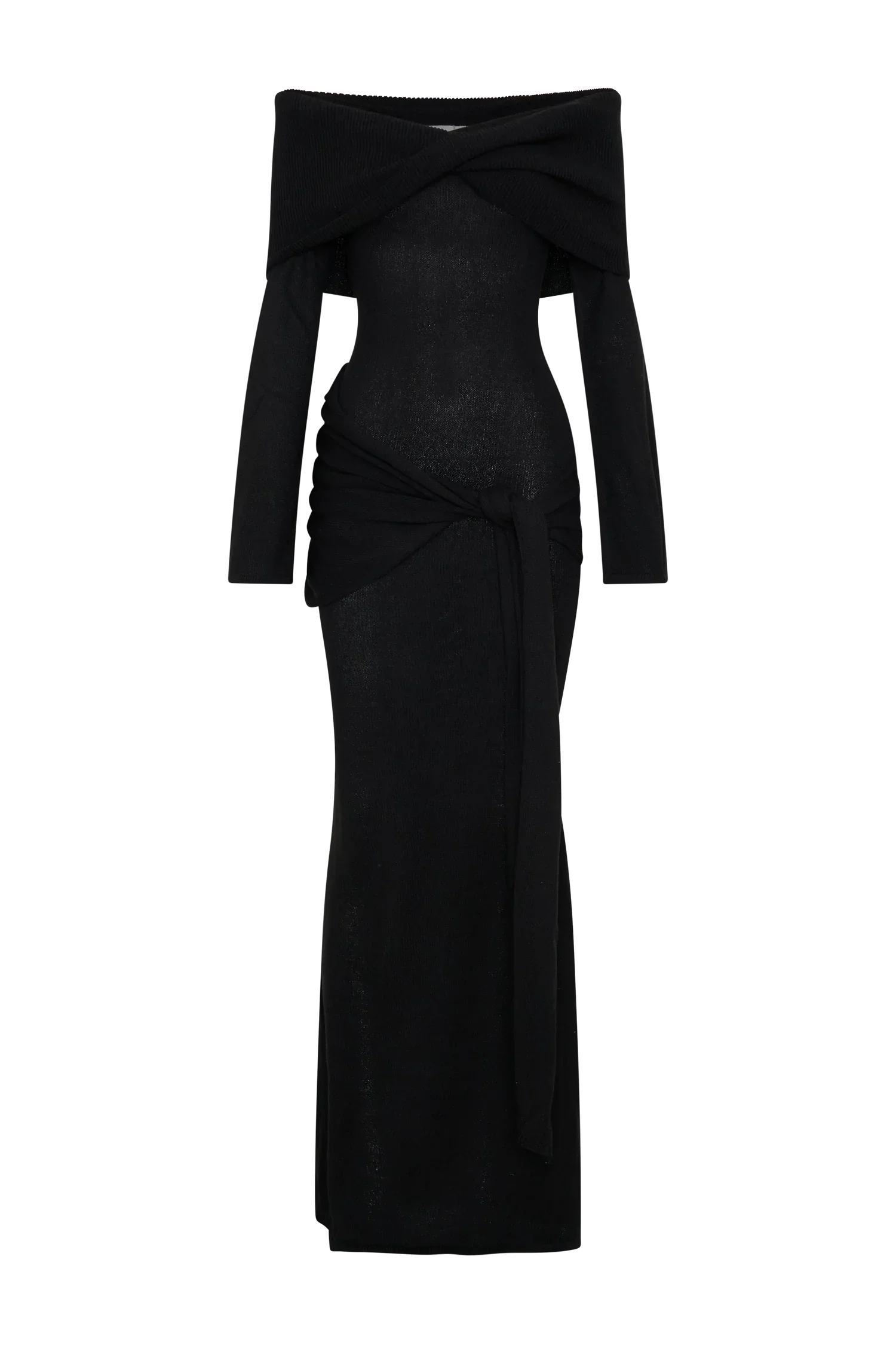 The CAMERON Off Shoulder Tie Maxi Dress is designed to make a statement with its off-the-shoulder neckline and sophisticated twist front overlay. Long sleeves and a bodycon silhouette sculpt the figure, flowing into a striking fishtail hem for added drama. The maxi length is complemented by a delicate tie detail at the hip, creating a refined yet effortless finish. Unlined in a soft knit, Cameron offers a seamless blend of luxury and comfort, perfect for your most elevated occasions.