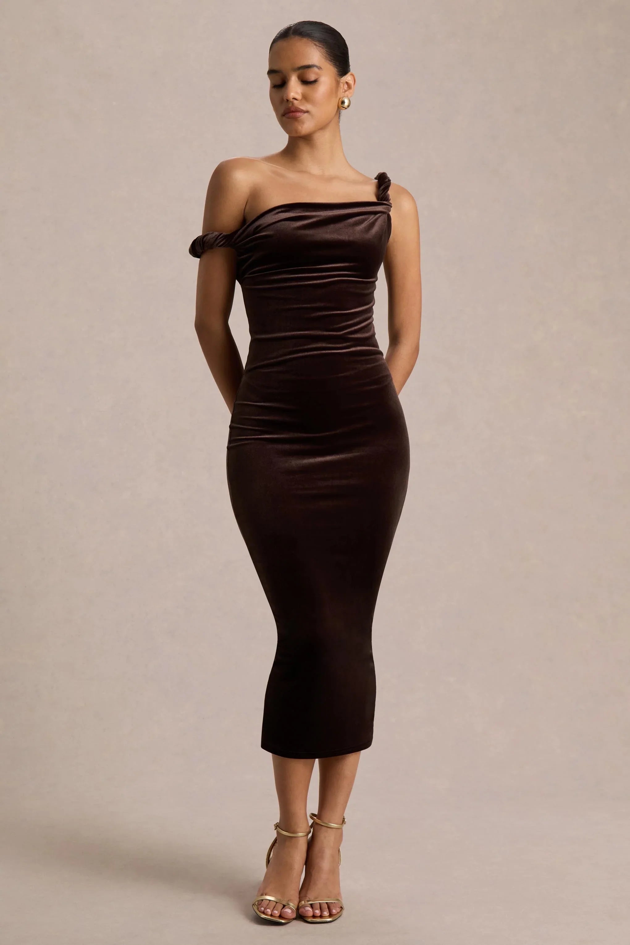 Defined by its luxurious texture and contemporary design, Carella is a striking choice for your next evening event. Crafted from our premium brown velvet, this midi dress features a twisted front detail that accentuates your waist and an asymmetric hemline that adds a touch of modern drama. The rich velvet fabric enhances your silhouette, while the unique neckline brings an elevated elegance to the look. Keep Carella in the spotlight with sleek stilettos and minimal jewelry, finishing the ensemble with a chic clutch and a soft wave in your hair for an effortlessly sophisticated finish.