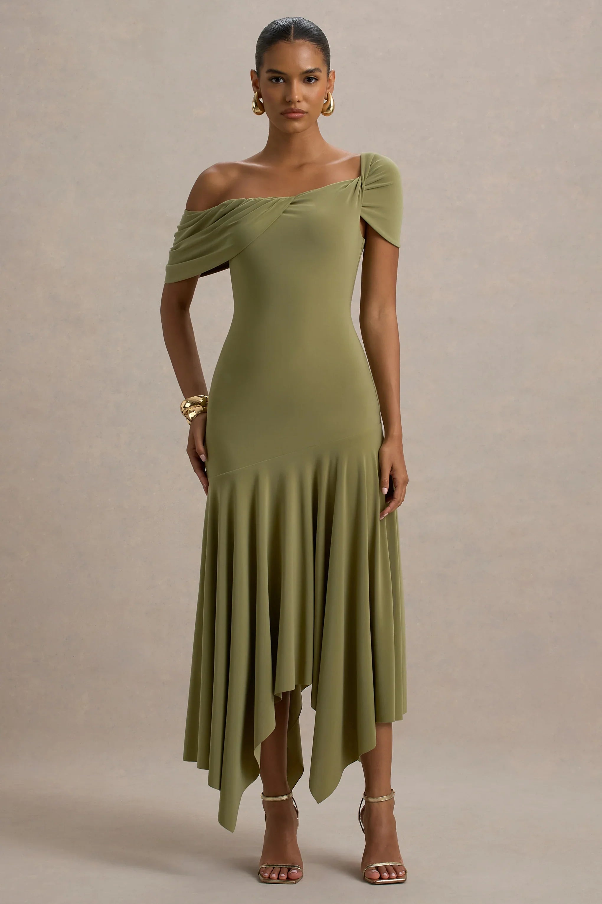 Whether you're searching for the perfect wedding guest dress, garden party look or baby shower staple, Castor is your answer. Crafted from our premium stretch jersey in a subtle shade of olive, this asymmetric midi will see you through the season with grace and class.