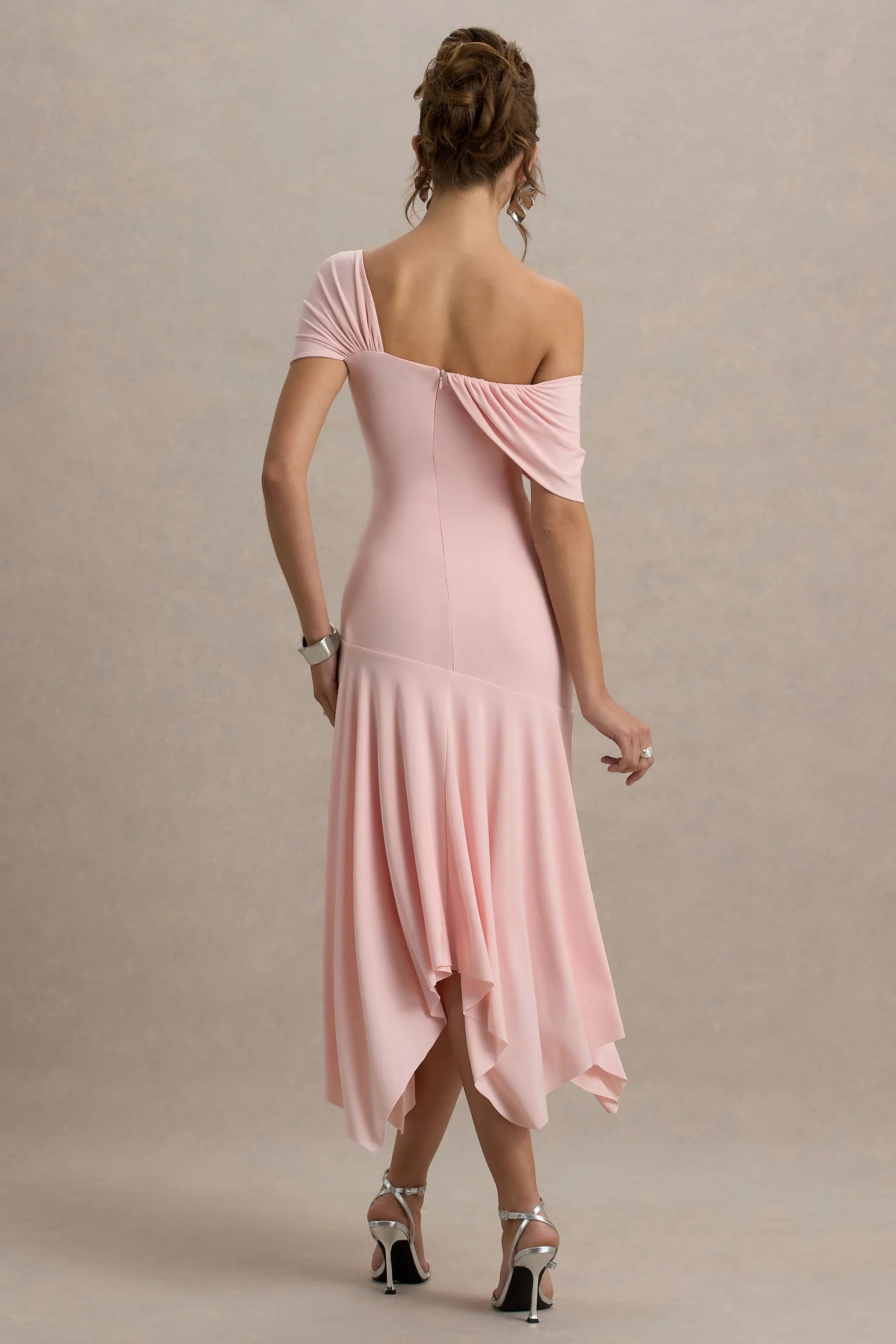 Whether you're searching for the perfect wedding guest dress, garden party look or baby shower staple, Castor is your answer. Crafted from our premium stretch jersey in a subtle shade of pink, this asymmetric midi will see you through the season with grace and class.