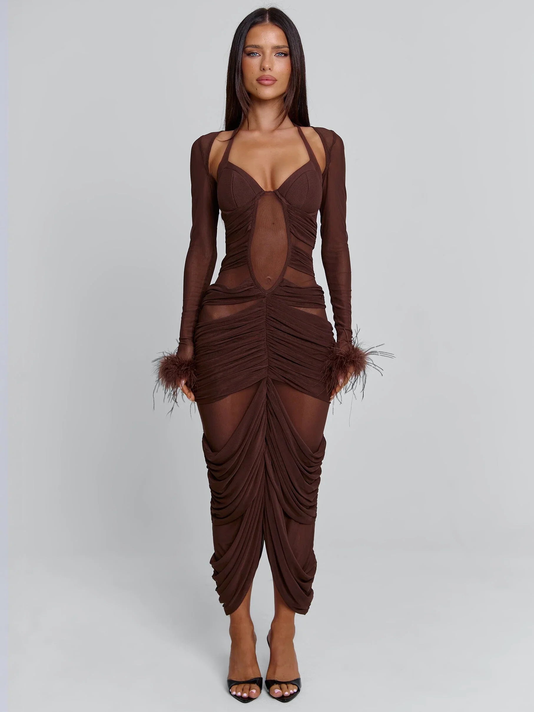The Cherrey Maxi Dress in Chocolate is a beautifully crafted mesh silhouette designed to flatter!
