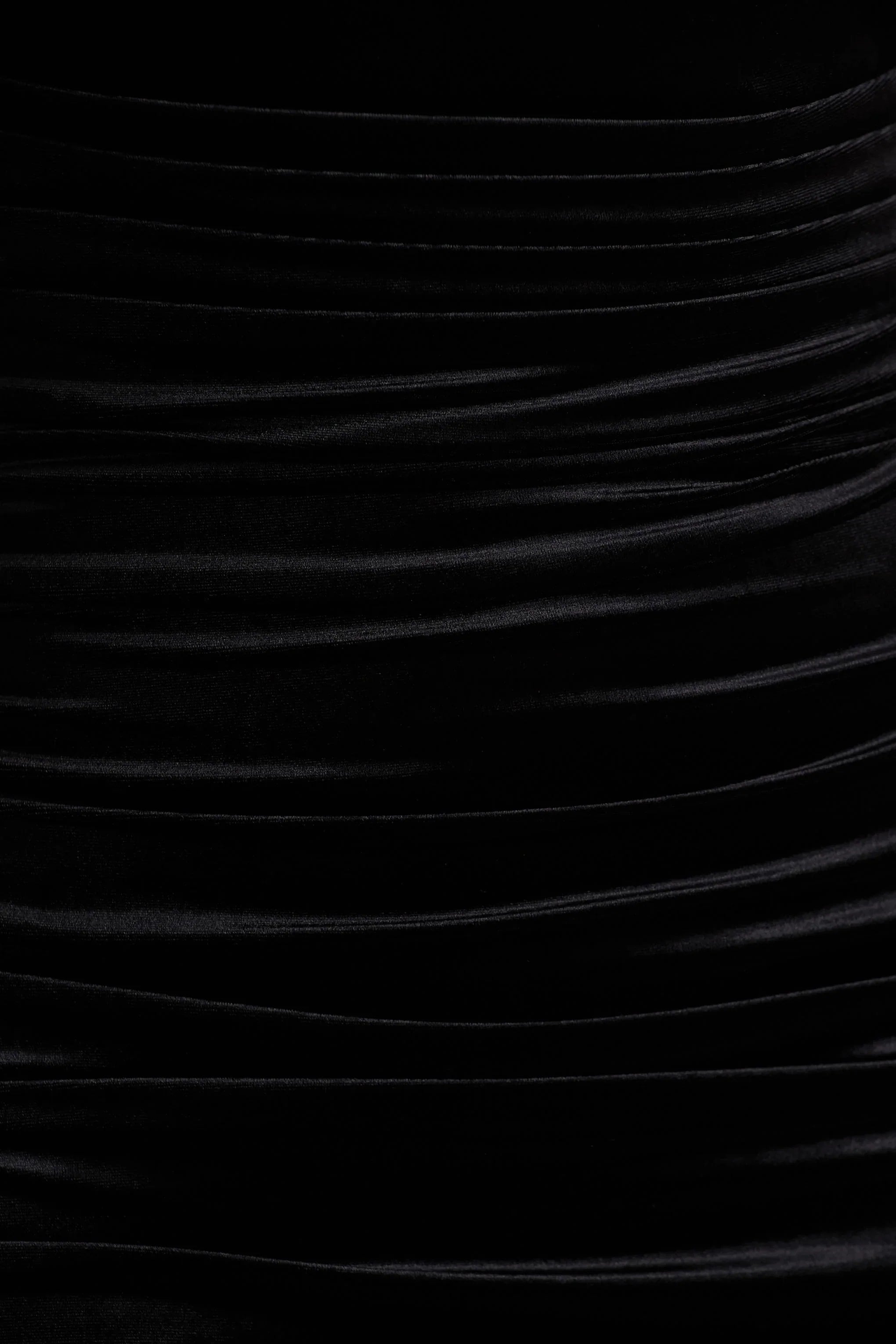 Meet Chrissy, the show-stopping silhouette your evening wardrobe has been waiting for. Crafted in a rich black hue of our premium velvet, this stunning design falls to a sleek midi length that hugs every curve. The striking square neckline paired with short mesh sleeves adds a modern elegance, while the all-over ruched detailing sculpts and flatters from every angle. Finished with a sultry centre-back split, Chrissy is your go-to for glam nights and unforgettable entrances.