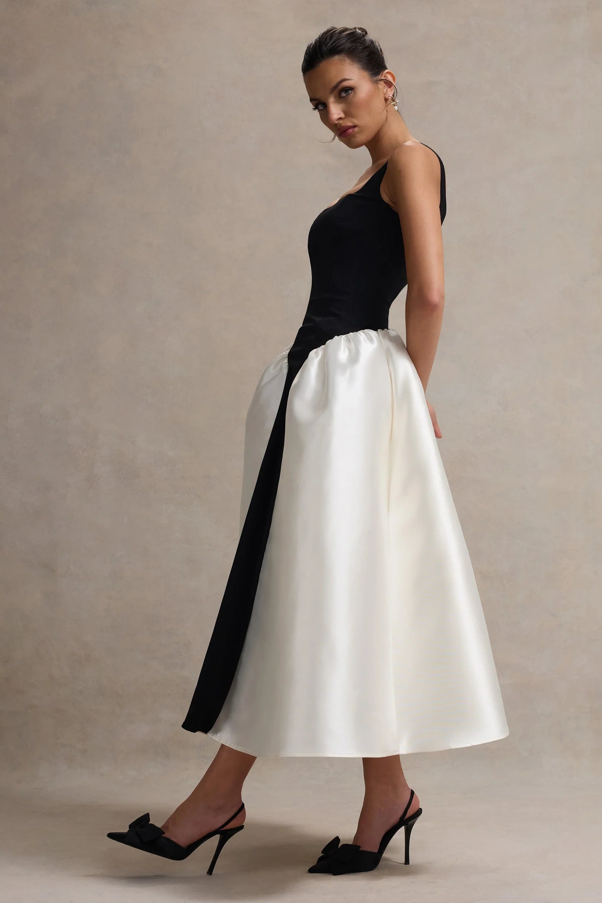 Boasting couture-like details, steal the spotlight this event season in Christie. Crafted in a premium stretch crepe, this black midi dress boasts a sculpting scoop neckline and boned corset bodice. Creating unexpected dimension and plenty of drama, Christie is complete with a cream volume skirt.