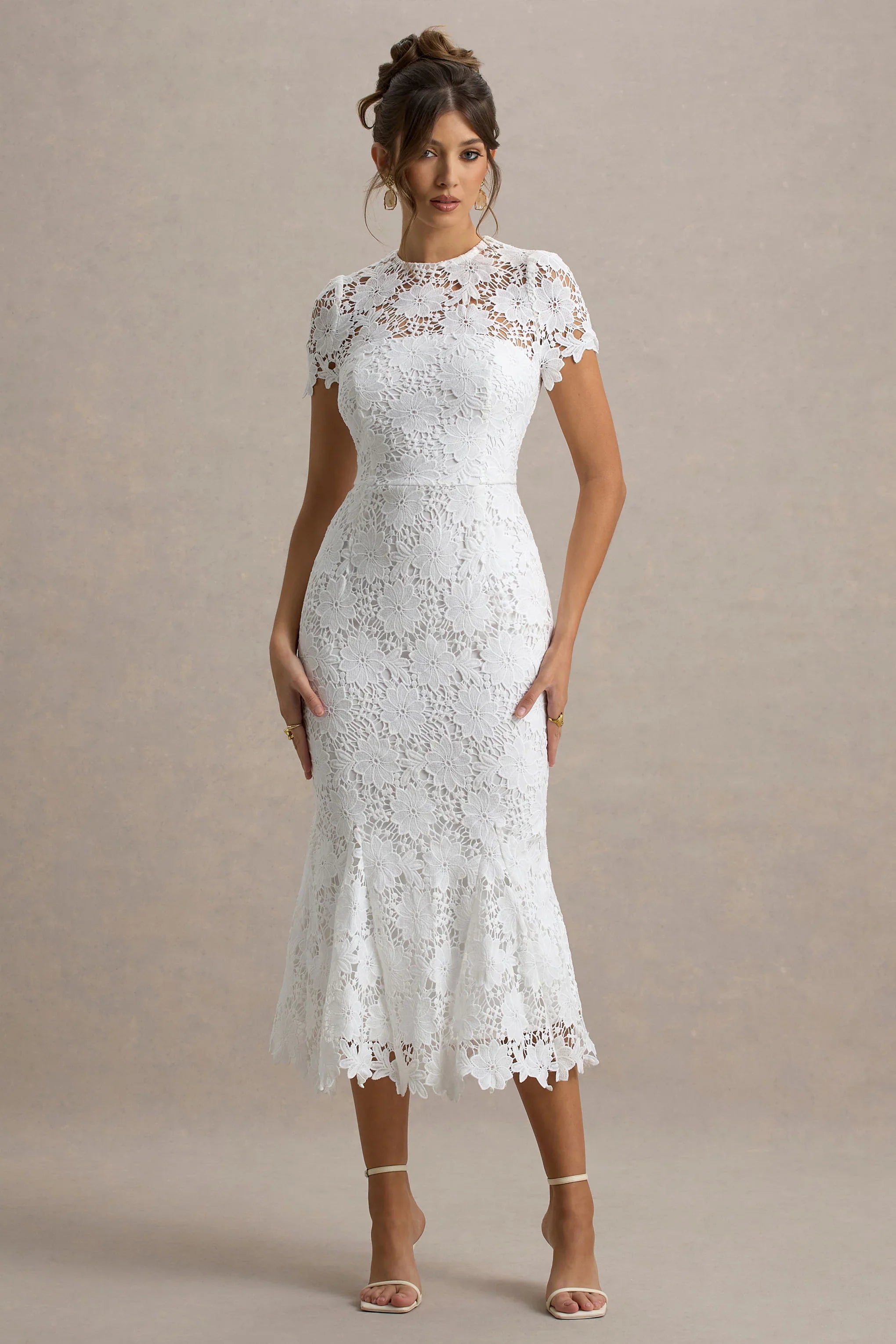 A vision of elegance, Clarissa is the definition of timeless sophistication. Designed in our premium white lace, this stunning midi dress strikes the perfect balance between romance and allure. The high neckline and cap sleeves create a refined, feminine finish, while the sculpting silhouette skims your curves beautifully. Whether you're attending a black tie event or an intimate evening affair, Clarissa ensures you make an unforgettable entrance. Style with sleek heels for an effortlessly polished ensemble.