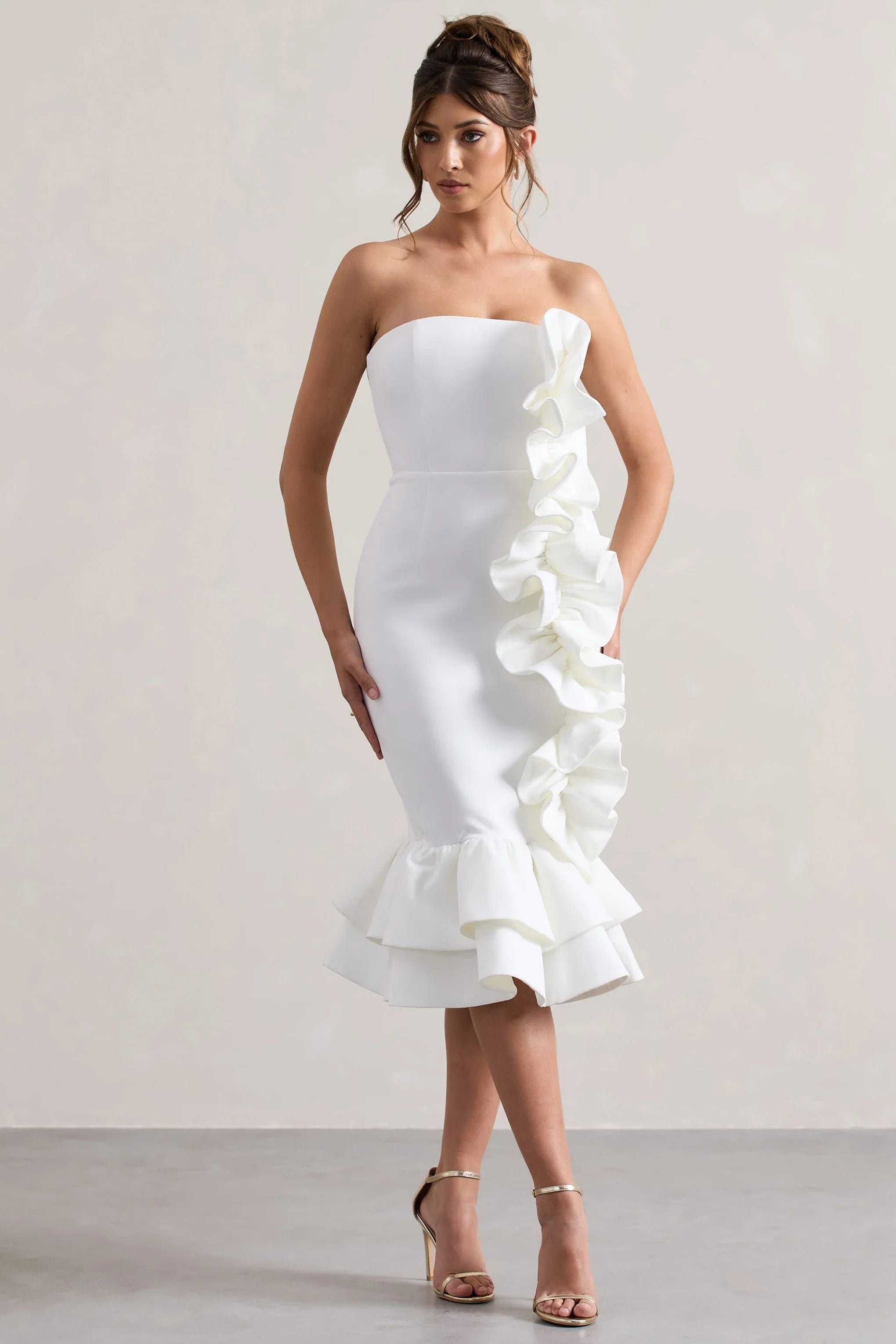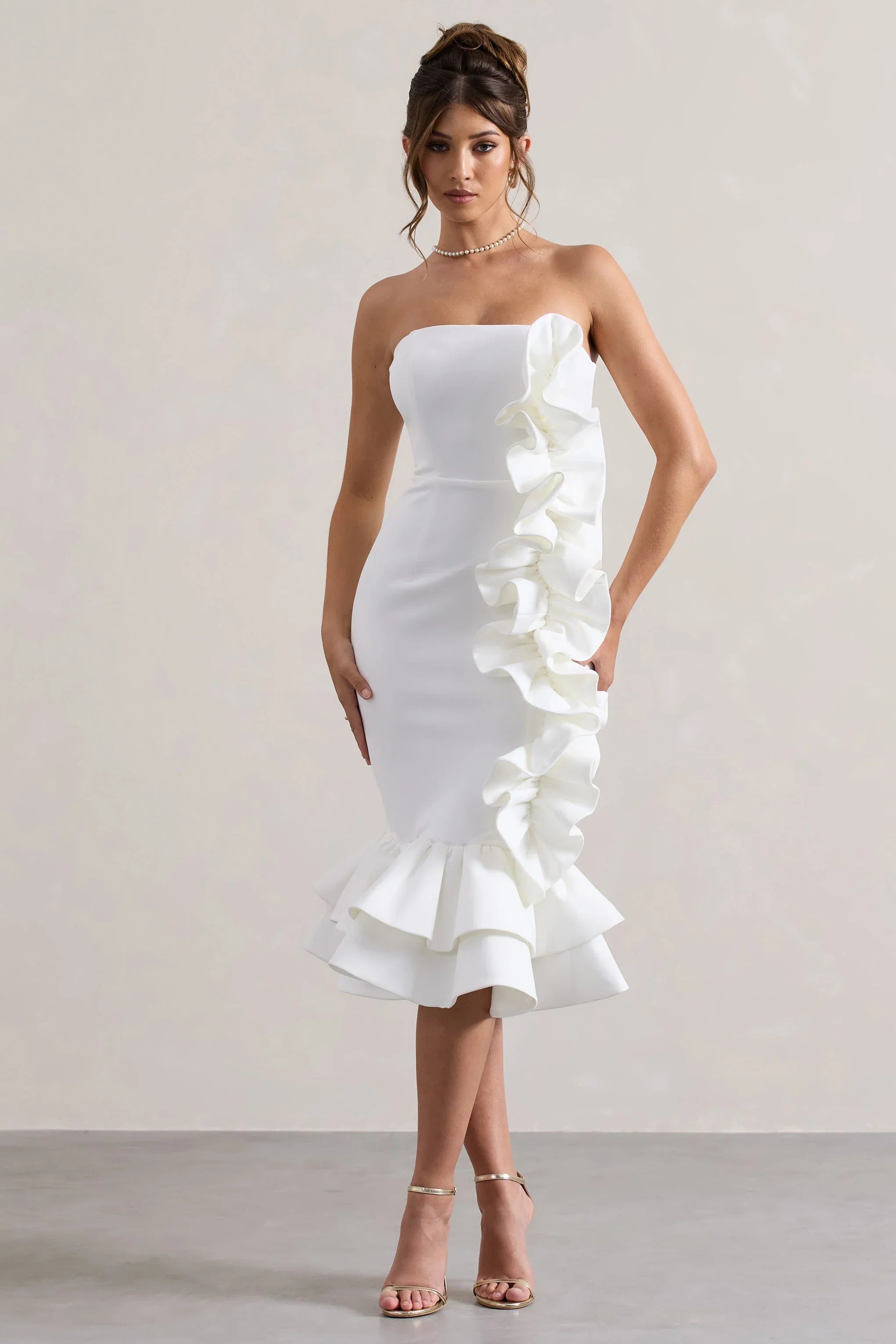 A perfect occasion piece, this opulent midi is a must-have for any upcoming special event. Crafted in a crisp cream shade of our premium stretch crepe, this strapless style is defined by an eye-catching ruffle that flows down your silhouette. Complete with a layered hemline, compliment Concept with some statement stilettos during your next race day.
