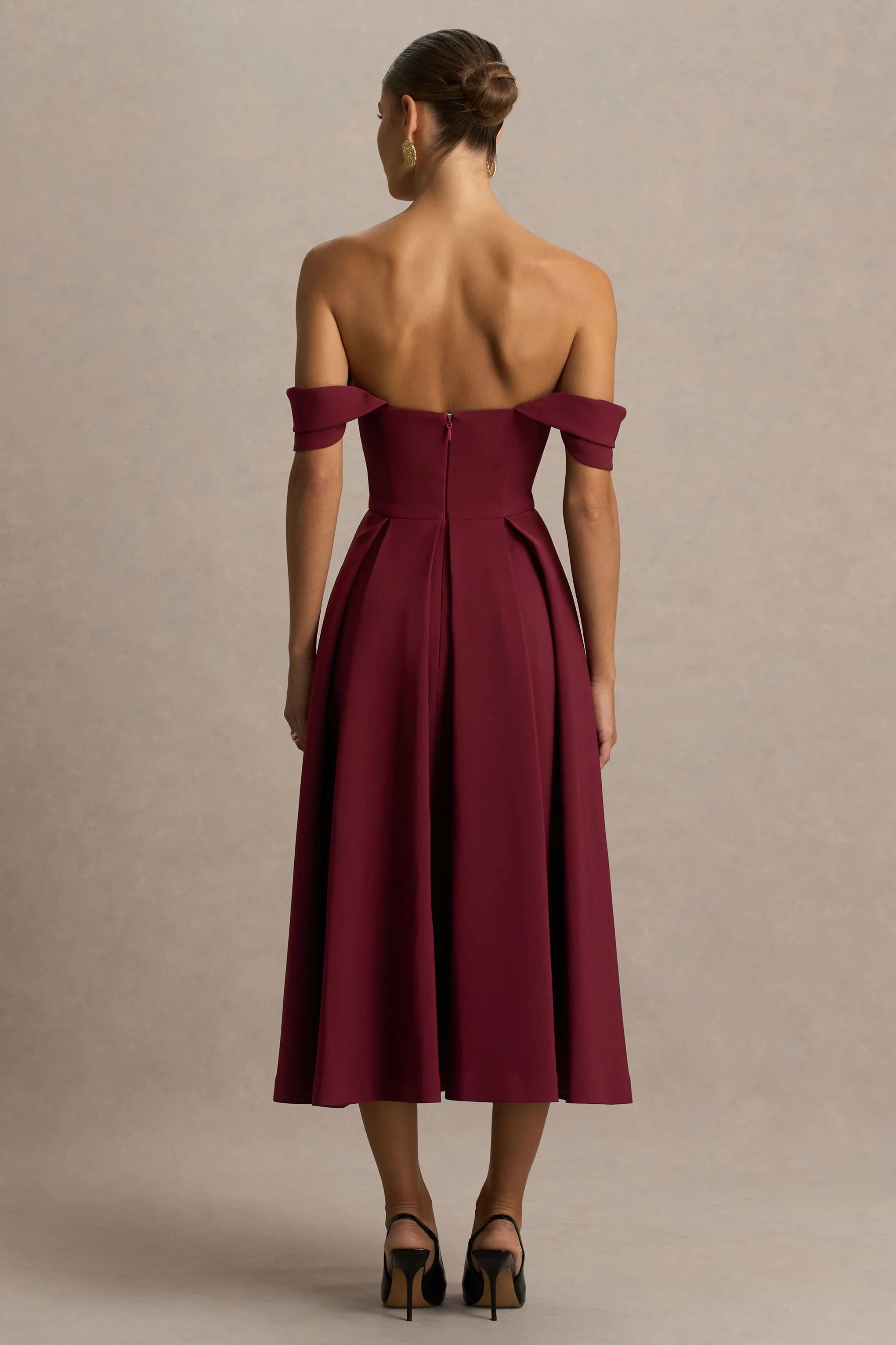 Say hello to Cosima, a timeless midi designed with a modern twist. Crafted from our premium burgundy crepe, this chic style is timeless romance at its finest. Featuring a flattering bardot neckline with elegant draped sleeves for a romantic finish. The skater skirt adds playful movement, while the midi length keeps the silhouette effortlessly sophisticated. Perfect for occasions that call for elegance with ease.