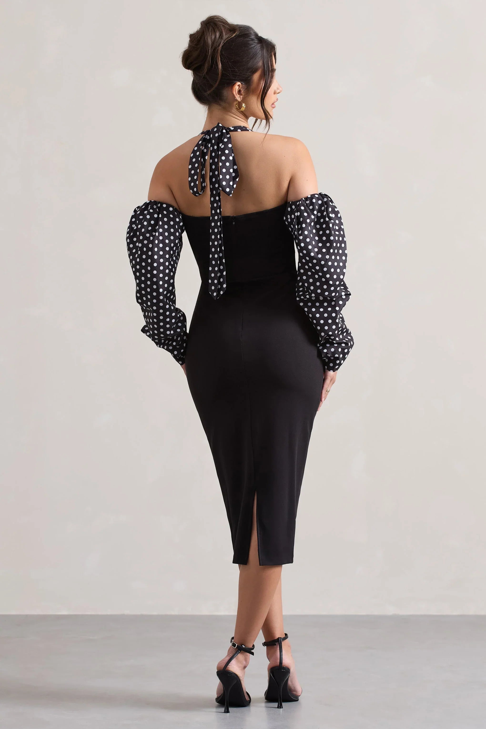 Sophistication meets romance in our latest midi Couture Client. Designed in a sculpting knitted crepe, this black polka dot print midi dress showcases a self-tie halter neckline, elegant puff-sleeves and a flattering fitted bodice. Style with a pair of court heels and a tousled bun to elevate your look.