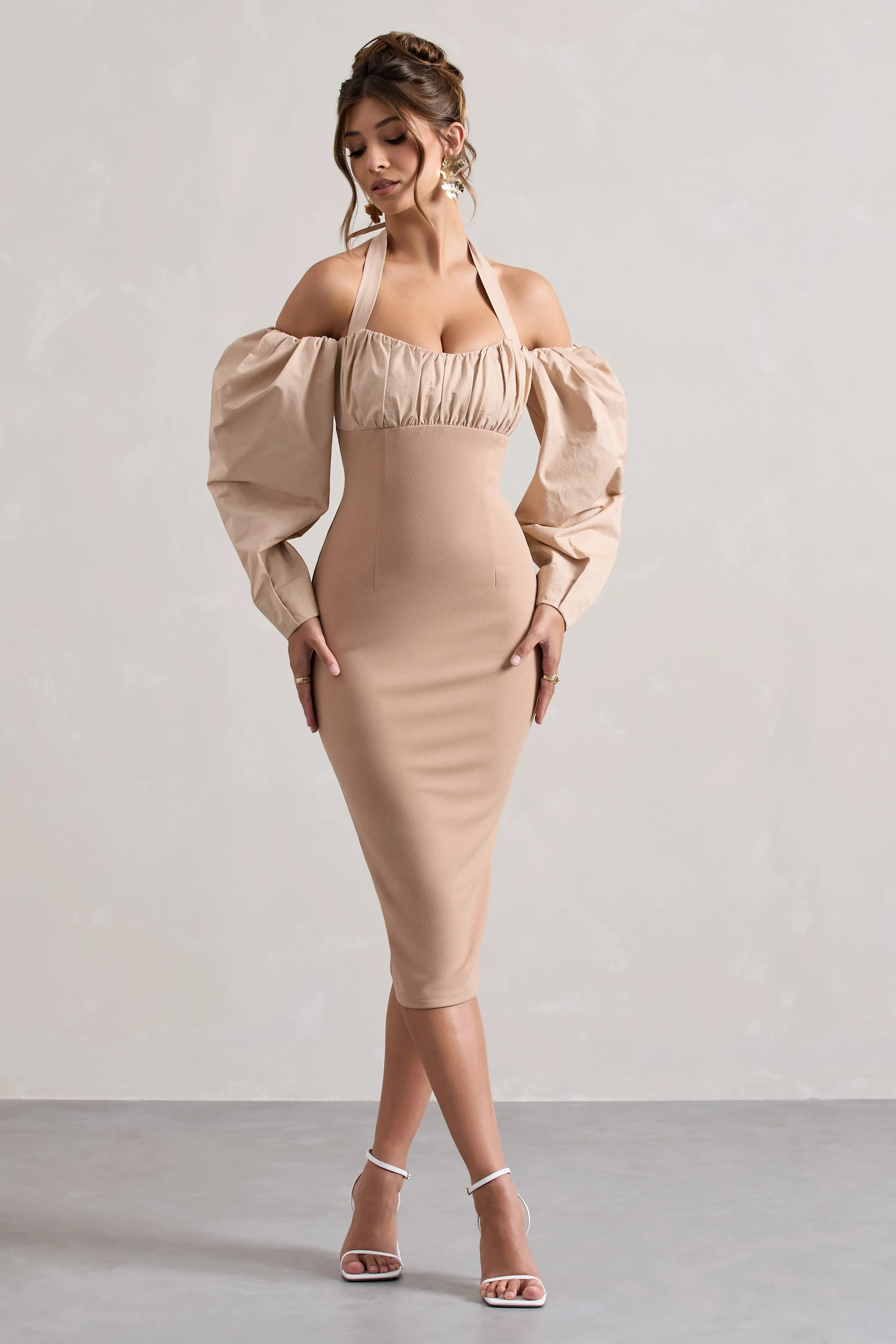 Sophistication meets romance in our latest midi Couture Client. Designed in a sculpting knitted crepe, this champagne midi dress showcases a self-tie halter neckline, elegant puff-sleeves and a flattering fitted bodice. Style with a pair of court heels and a tousled bun to elevate your look.