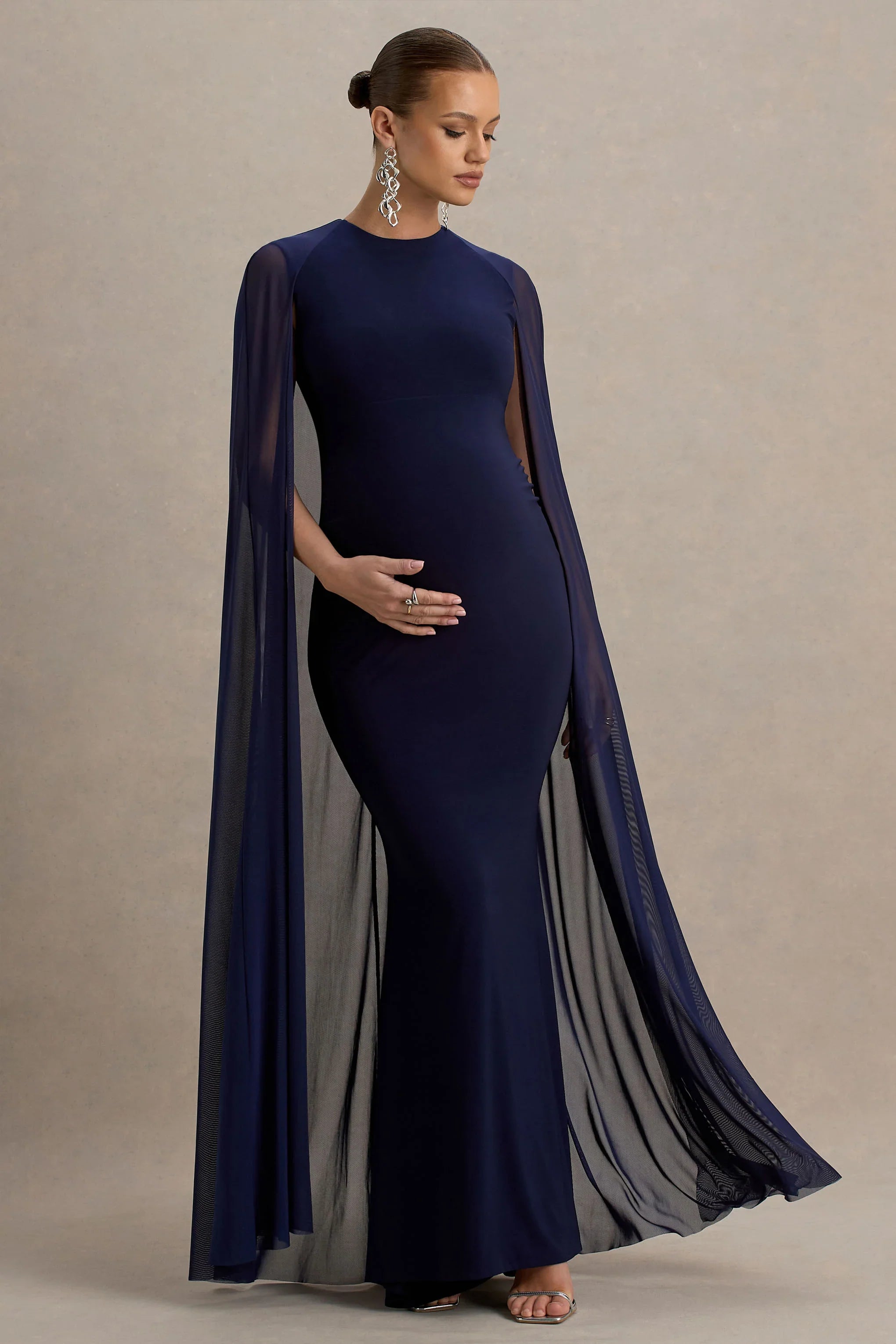 Captivate the room with elegance in our latest showstopper, Currant. This maxi is cut in an enchanting navy hue of our premium stretch jersey, giving you the ultimate, figure flattering fit. Designed with a chic racer neckline and a delicate, yet striking, mesh cape that'll turn heads at your next upscale occasion. Finished with ruched detailing that is mindfully placed to enhance your figure, whilst maximising comfort. From weddings to glamorous galas, in this show stopper you will have all eyes on you.