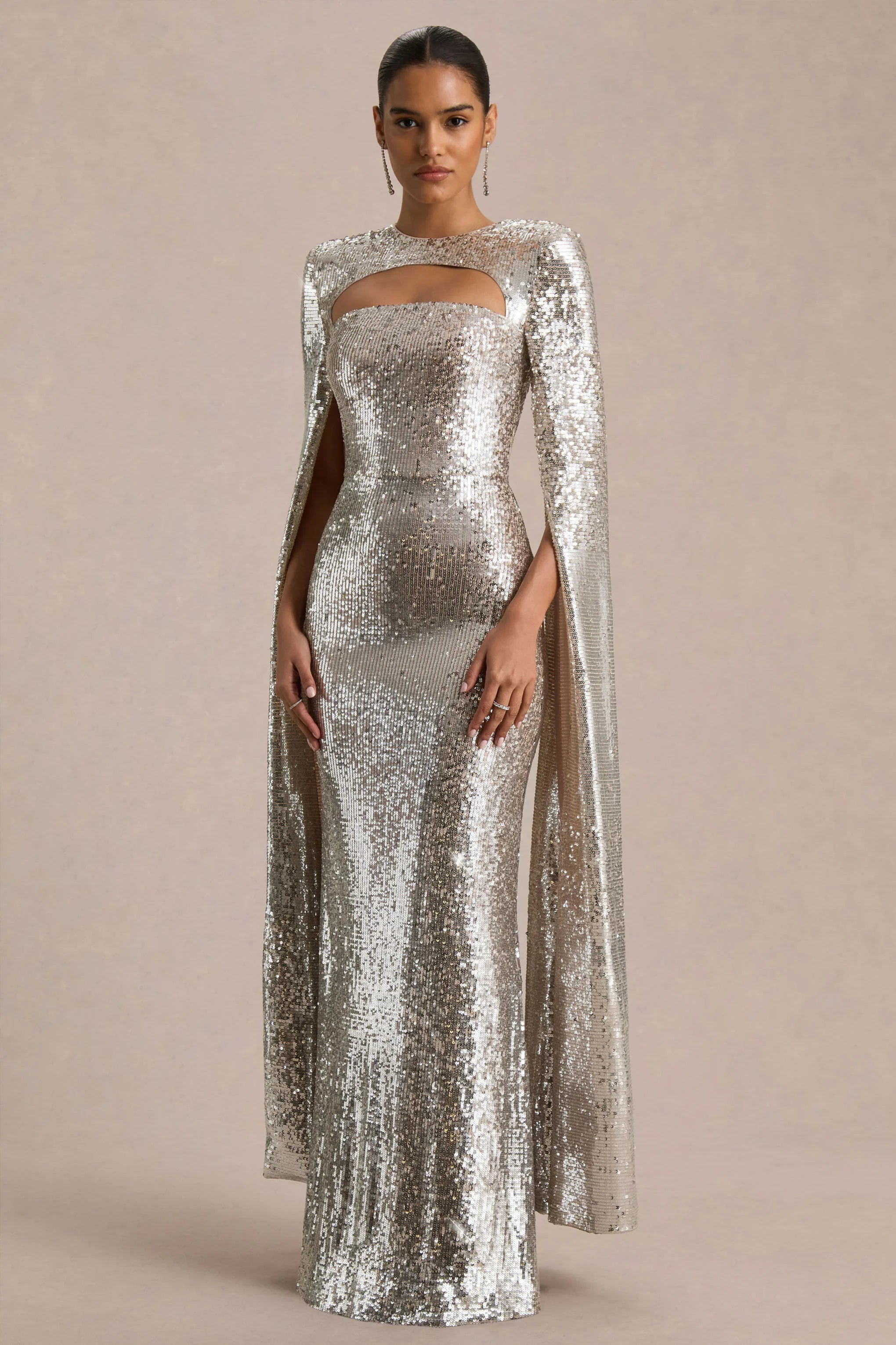 Say hello to Devora, a statement maxi designed to captivate from every angle. Cut from premium silver sequins, this show-stopping style is the head-turner you need. Designed with a sleek crew neckline that balanced by daring cut-out details for a modern edge. The dramatic cape sleeves cascade to the floor, creating striking movement with every step. Devora is the perfect fusion of glamour and sophistication, made for nights where all eyes are on you.