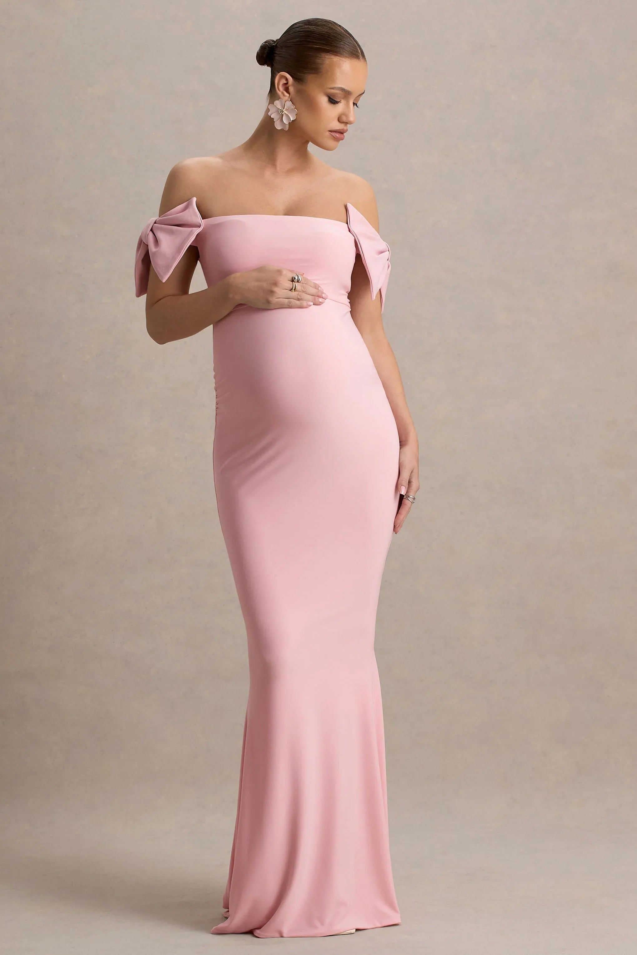 Introducing our latest maxi, designed to turn heads say hello to Didi. This gown is curated in a soft pink hue of our premium stretch jersey, for a sculpting and flattering fit. Featuring a delicate, feminine bardot neckline with gorgeous bow sleeve details adding a romantic touch. Completed with intricate ruched detailing, placed perfectly to enhance your figure and flatter your curves. Style Didi with gold accessories for your next evening occasion.