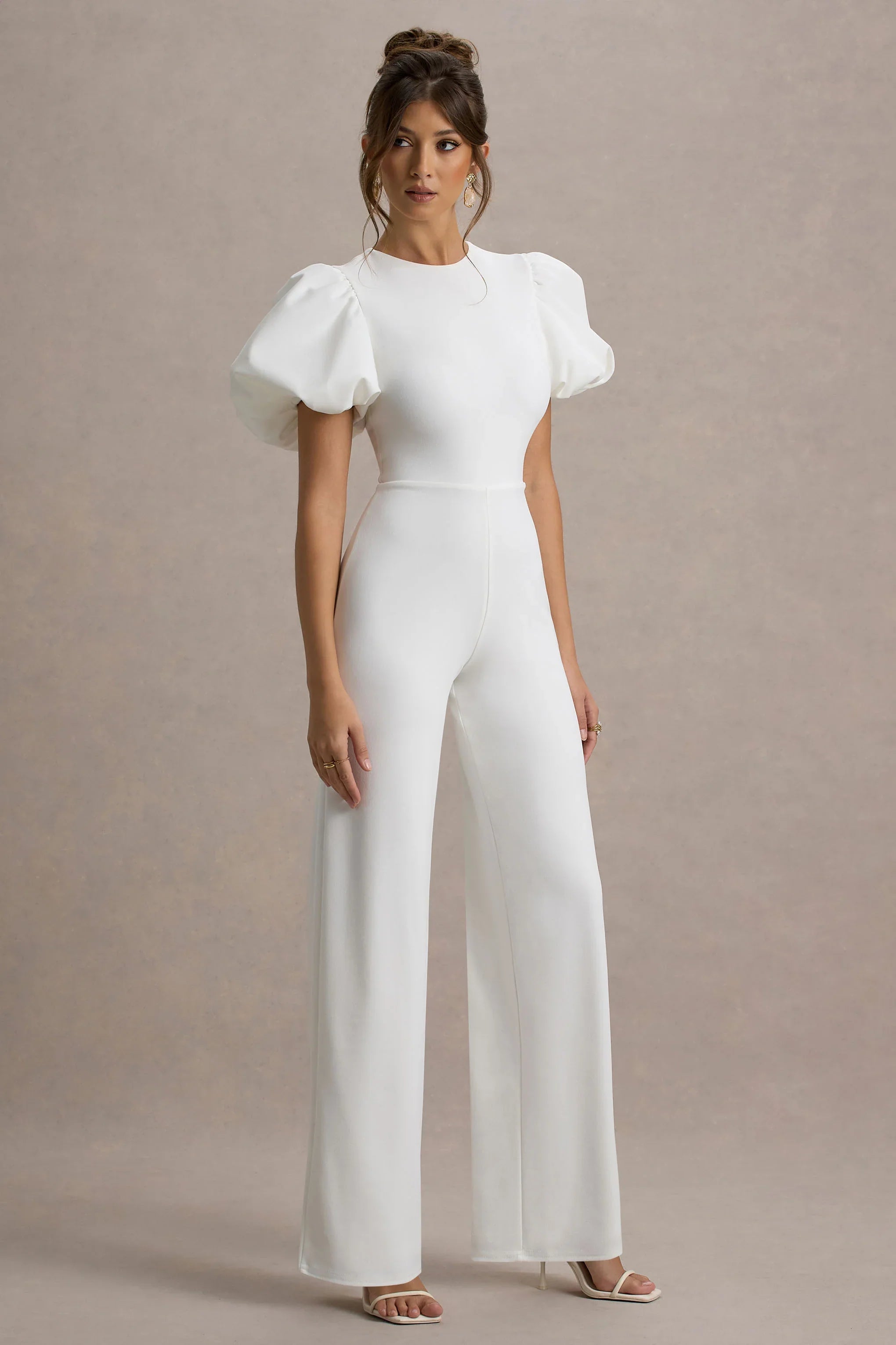 Defined by its sleek tailoring and sophisticated edge, Dillon is a captivating choice for your next special occasion. Crafted from our premium scuba crepe in a deep white hue, this jumpsuit features statement puff sleeves that add a touch of drama. The structured bodice transitions seamlessly into straight-leg trousers, creating a streamlined silhouette that flatters your figure. Try styling Dillon at the forefront with delicate accents for a modern twist on evening elegance.