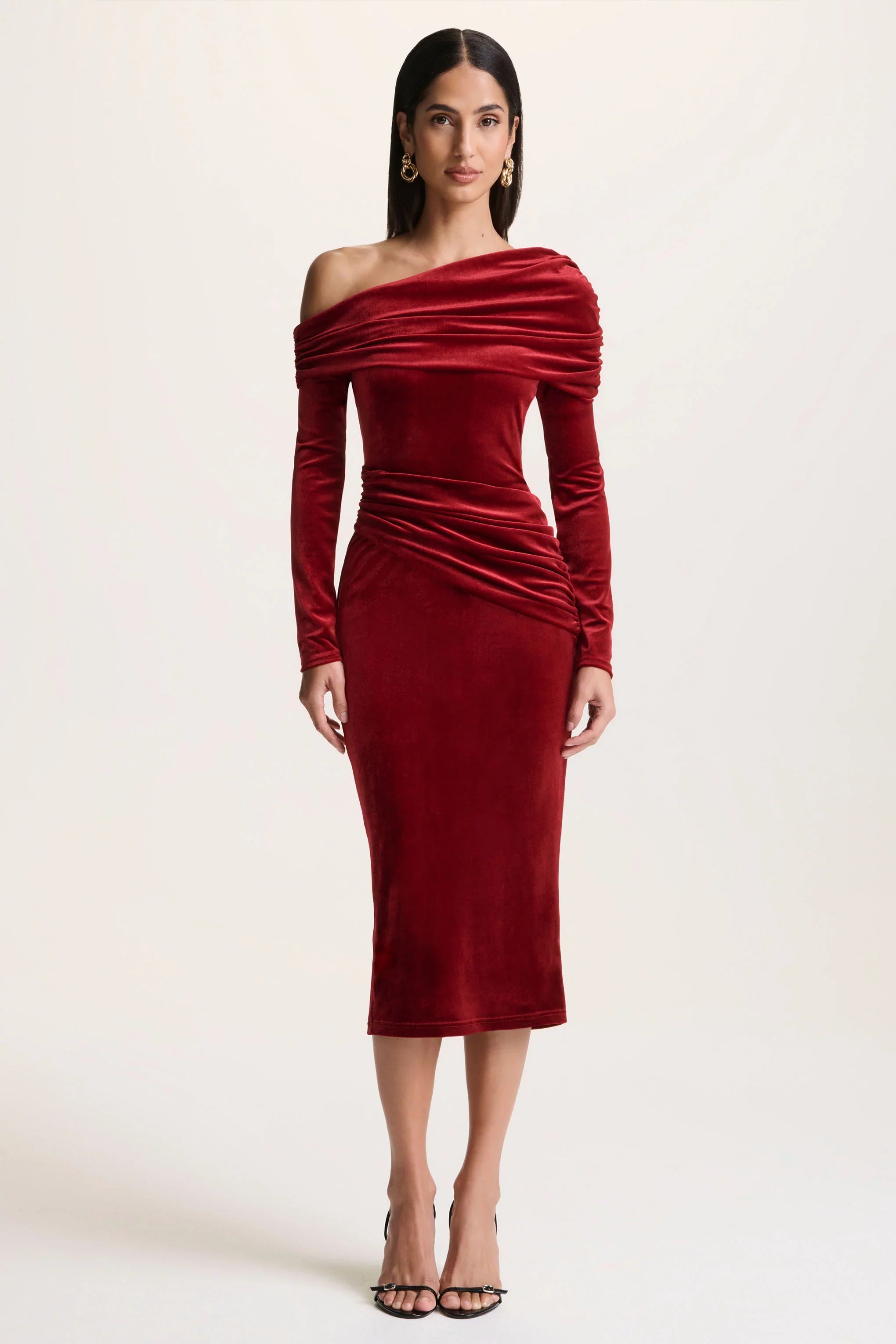 Eirene radiates effortless elegance with a modern twist. Crafted from our premium velvet in a rich red hue, this midi dress beautifully contours the silhouette. The asymmetric neckline adds a contemporary edge, while the gathered detailing enhances every curve with soft sophistication. Eirene is made for evenings that call for timeless style with a head turning finish.
