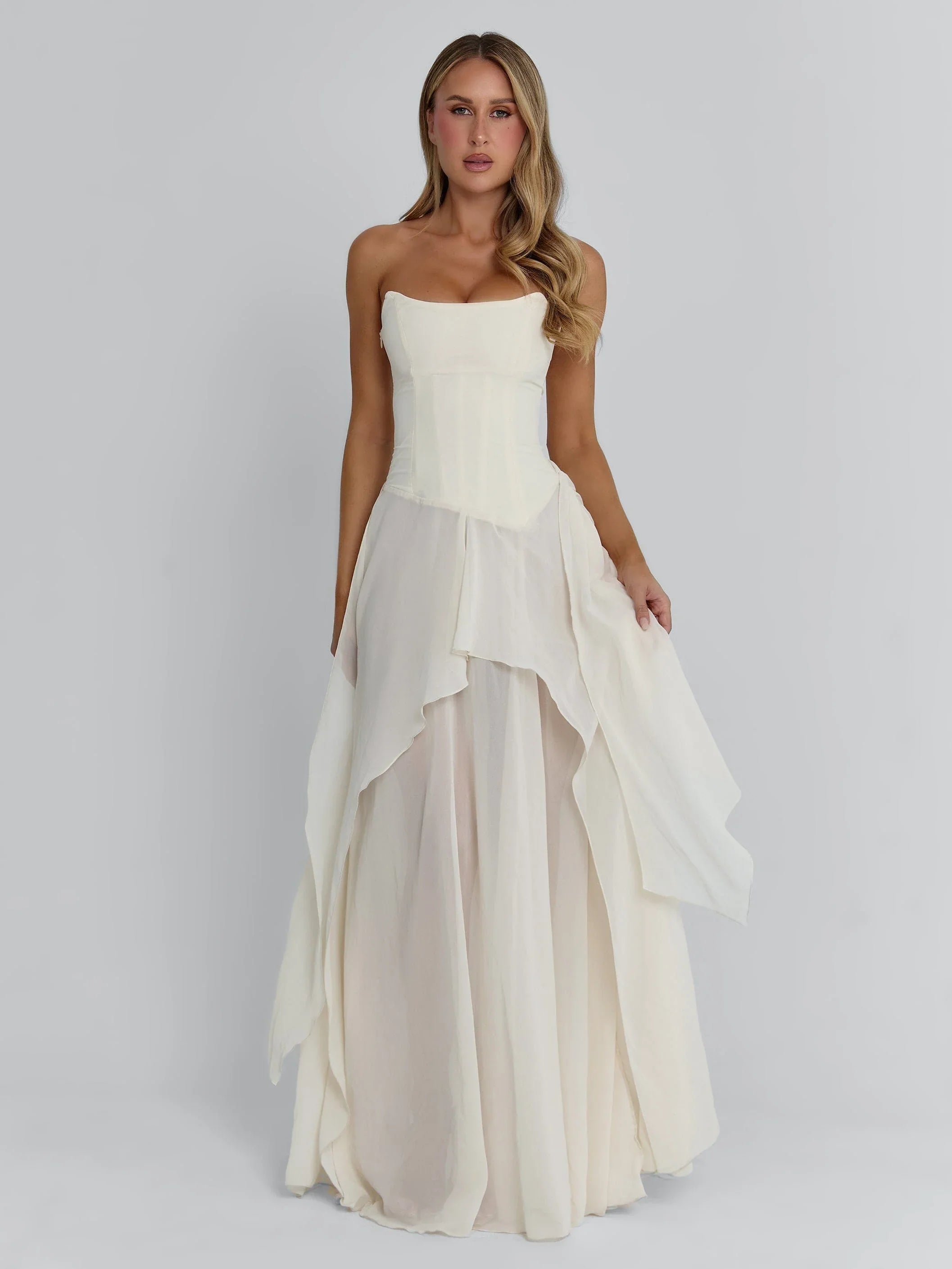 Crafted from soft georgette with layered panels and fluid draping, she creates a romantic, sculpted shape without the need for stretch. The bodice is structured with internal boning for support, while the workable front tie allows you to adjust the drape to suit your shape. Finished with a clean zip closure and a floor-skimming hem, Eisley moves beautifully with every step.