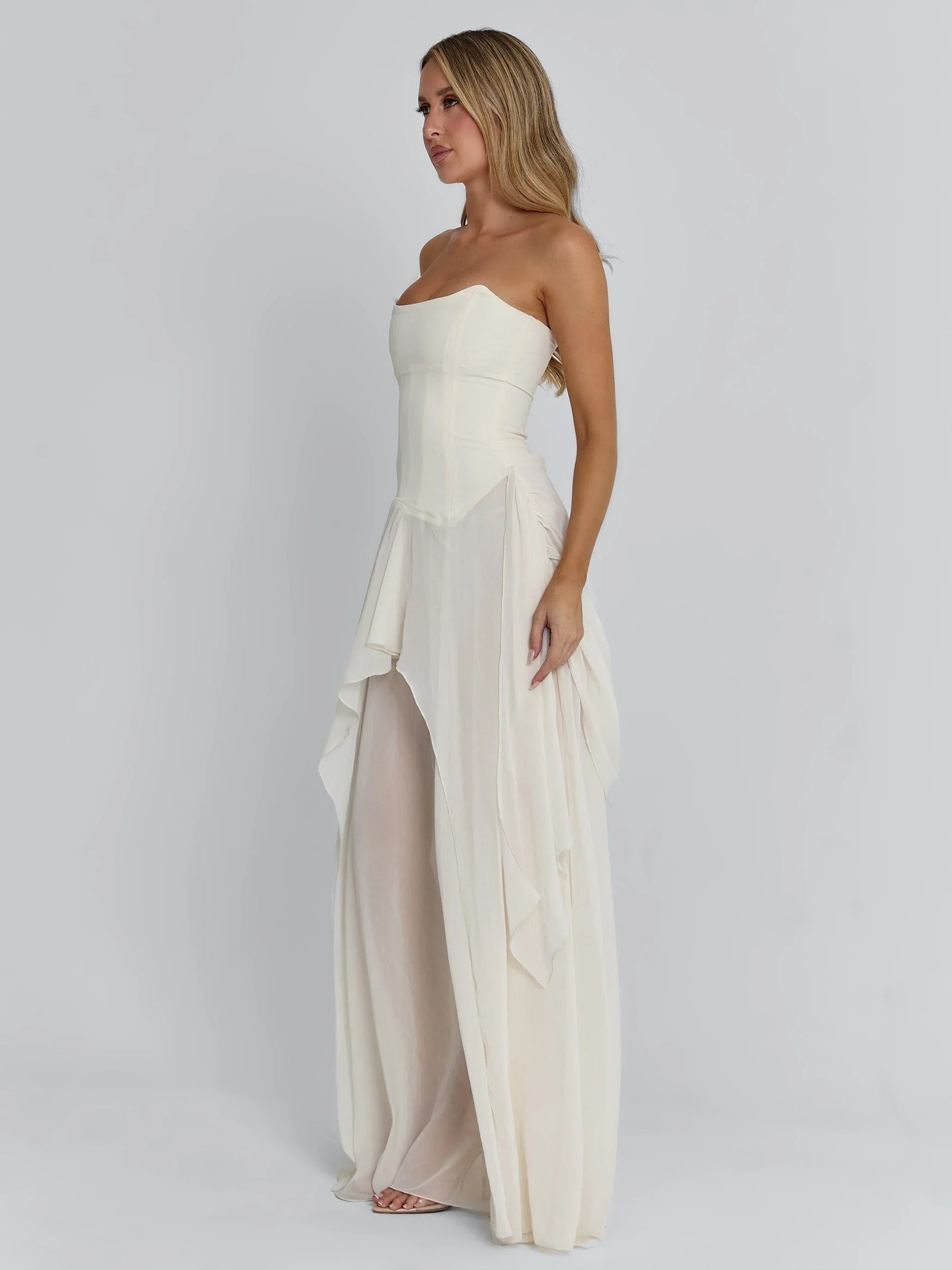 Our Eisley Maxi Dress in Ivory is a timeless, draped silhouette designed for formal evenings and special celebrations.