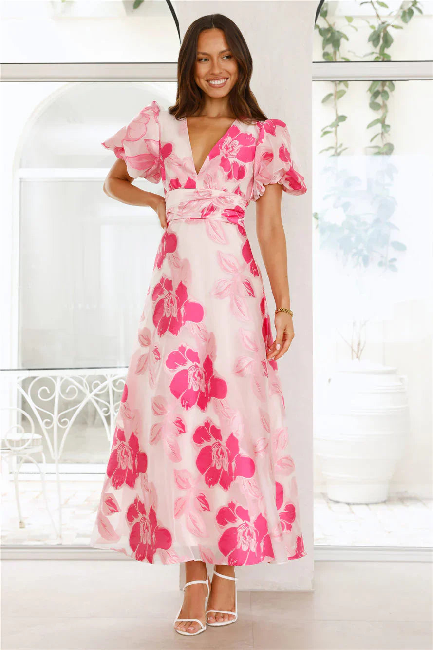 The Electric Rose Maxi Dress features elastic puff sleeves, a flattering V-neck, a flowy skirt, and a bright print for a perfect balance of playful and sophisticated. Pair with delicate gold jewellery and strappy heels for an effortless yet chic look.
