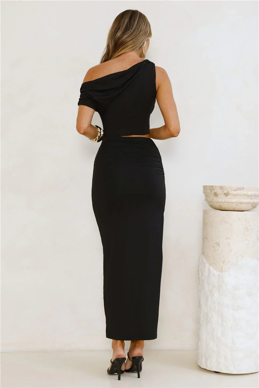 Step into effortless sophistication with the Elevated Everyday Off Shoulder Maxi Dress. Featuring a stunning off-the-shoulder design, a sleek waist cutout, and a gracefully flowing skirt for a chic and timeless look. Style with heels.