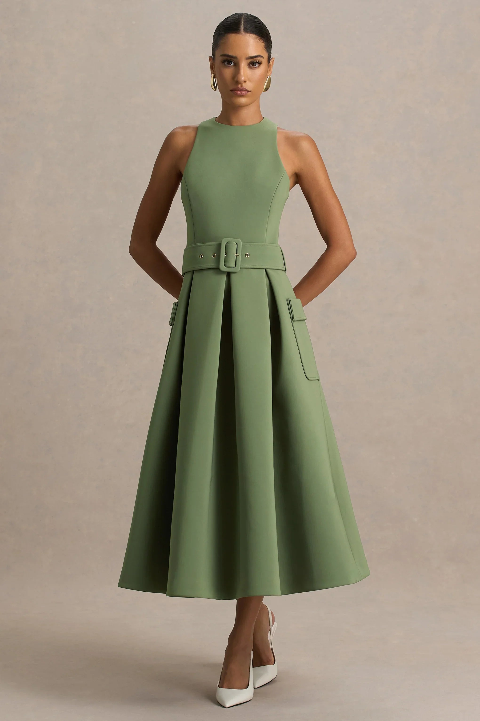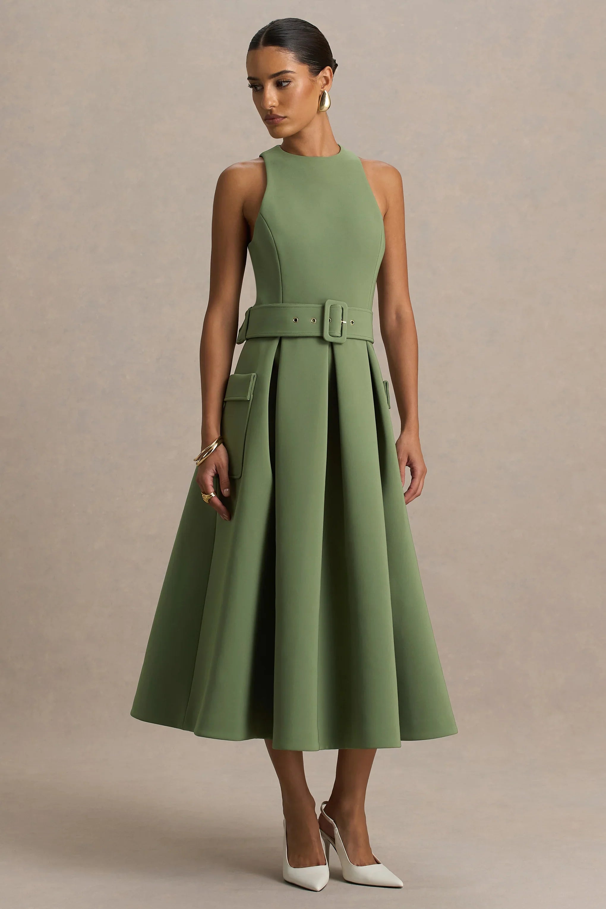 Say hello to Elisia, a chic essential that effortlessly blends comfort and style. Made from our premium stretch crepe in a flattering olive hue, this midi silhouette drapes beautifully to highlight your shape. Designed with a crew neckline for timeless appeal, Elisia features a belt detail to cinch the waist and pocket detailing polished finish. Perfect for elevating your everyday wardrobe.