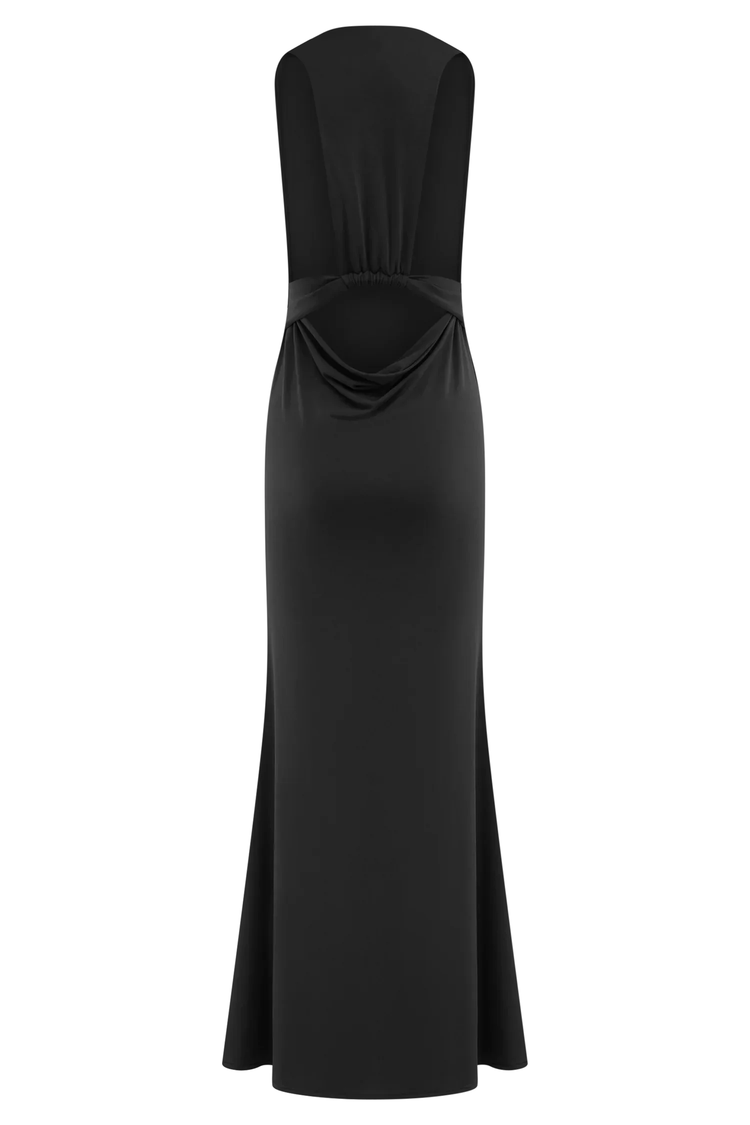 Turn heads in this sculptural silhouette, where fluidity meets form. Designed with a flattering V neckline and sleek front seam, this maxi dress showcases a racer back shape that flows into a softly draped cowl back skirt. The fishtail hem adds graceful movement, while full lining ensures a smooth, flattering finish. Perfect for evenings that call for understated drama and modern elegance.