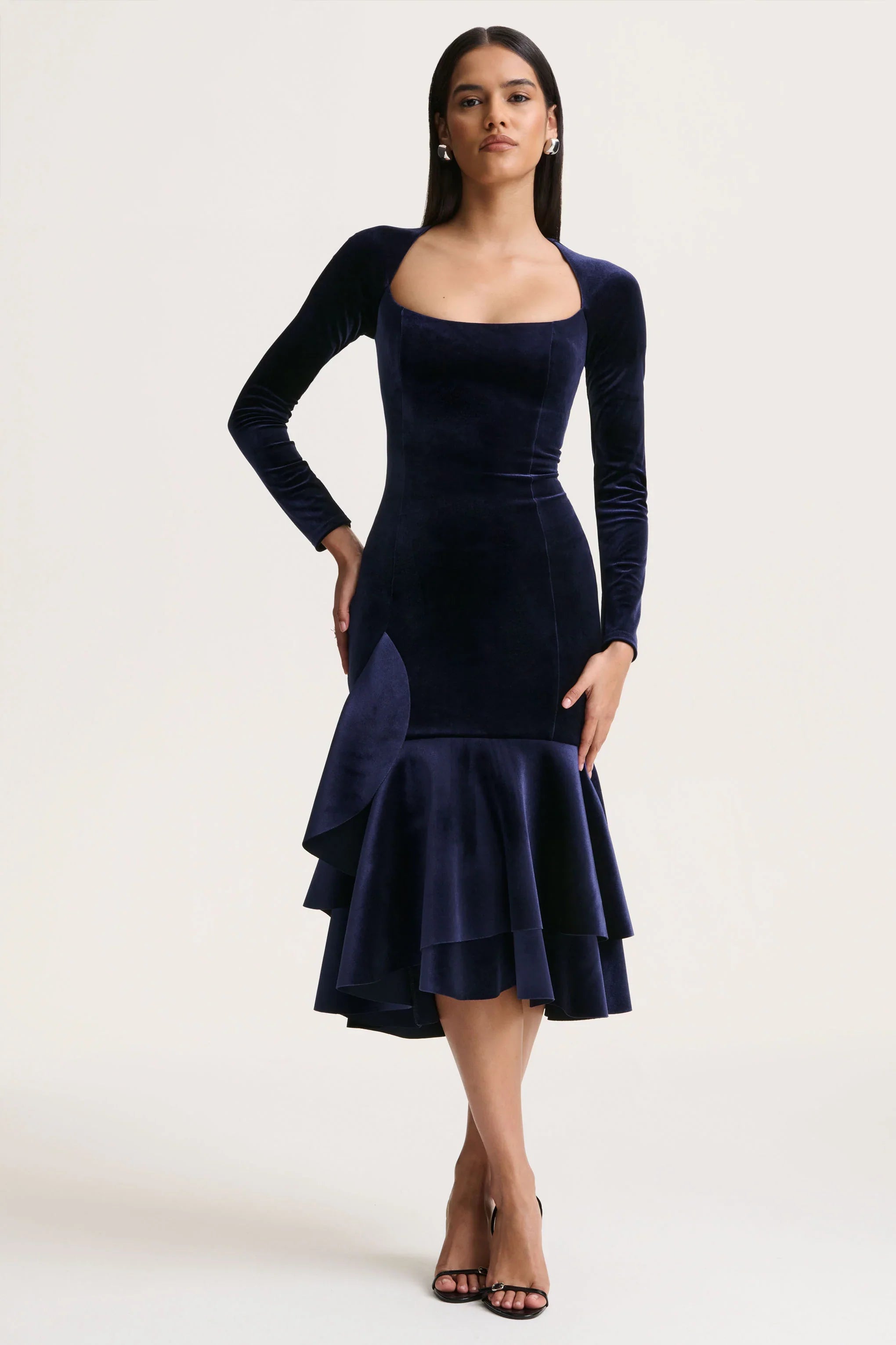 Emberlyn blends timeless elegance with a touch of dramatic flair. Crafted from luxurious premium velvet in a deep navy hue, this midi-length design skims the silhouette with refined sophistication. The scoop neckline and long sleeves create a sleek, balanced shape, while the ruffled fishtail hemline adds movement and a statement finish. Emberlyn is made for evenings that call for poise, confidence, and classic glamour with a modern twist.