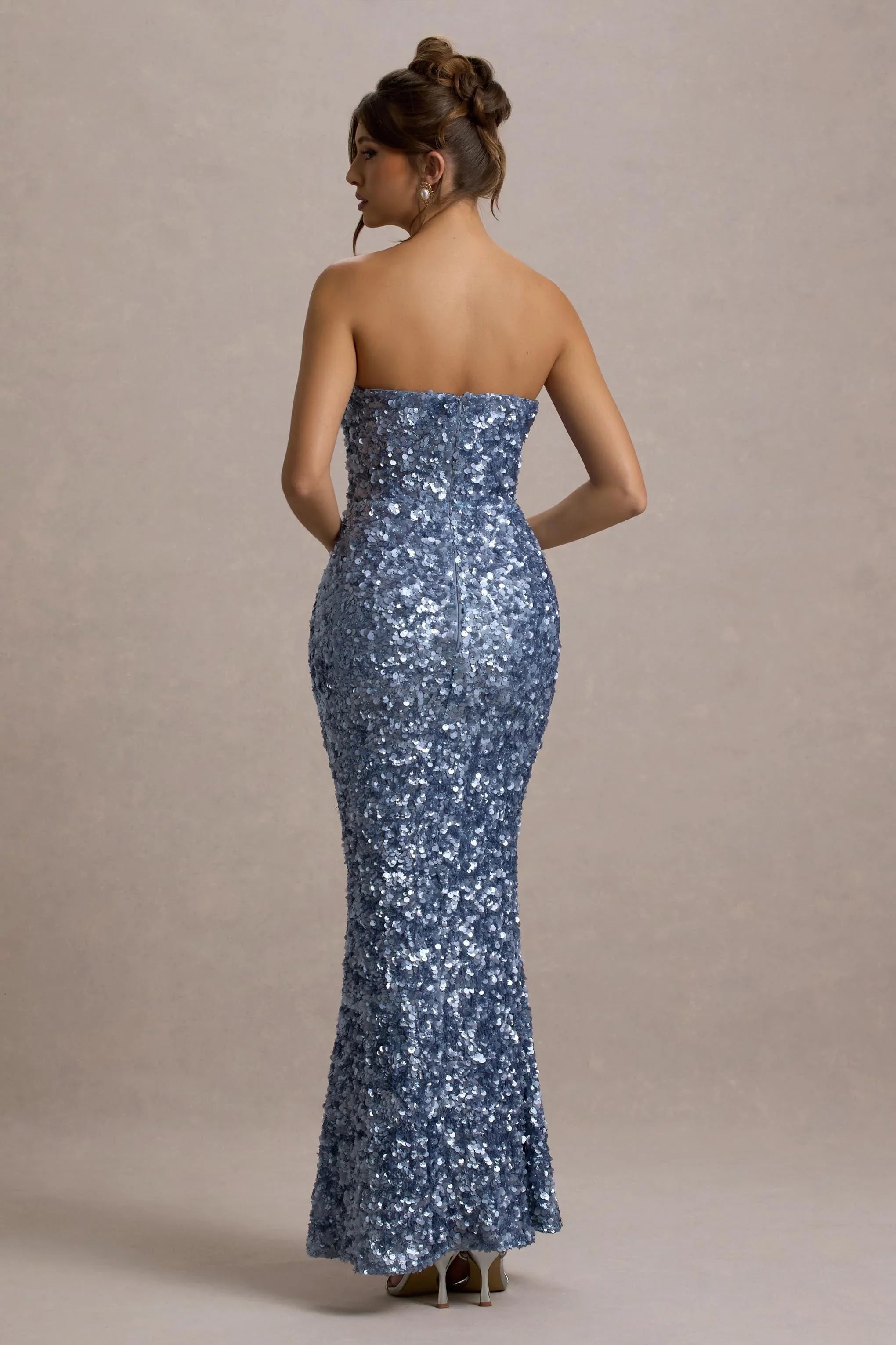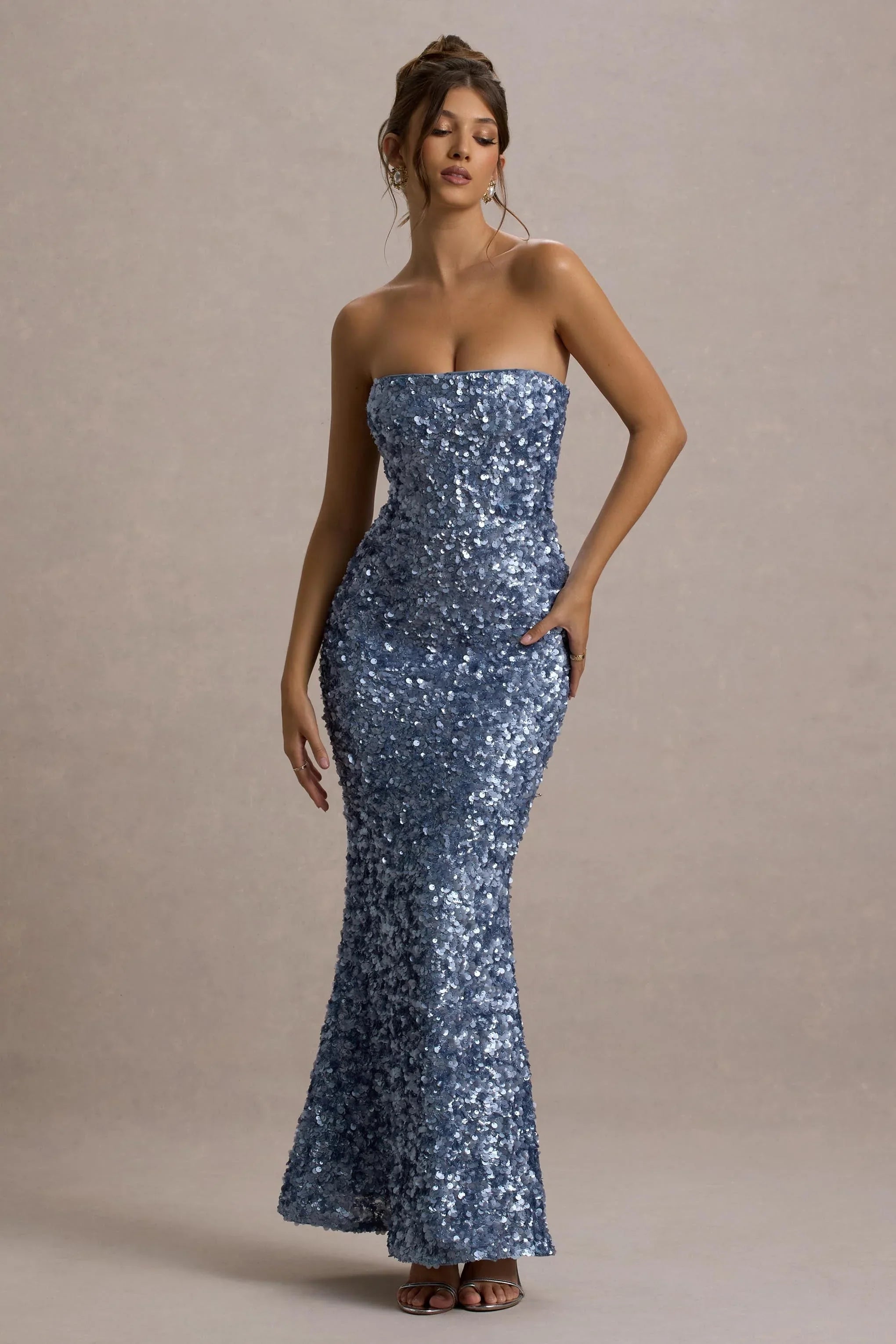 Defined by a cascade of eye-catching powder blue sequins, Evabeth is an exquisite option for your next unforgettable occasion. This strapless maxi dress is designed with a structured silhouette that enhances your curves, offering both glamour and elegance. Complete with a floor-grazing hem, Evabeth is made to shine on the dancefloor—perfect it with sleek hair and your favourite heels for a look that steals the spotlight.