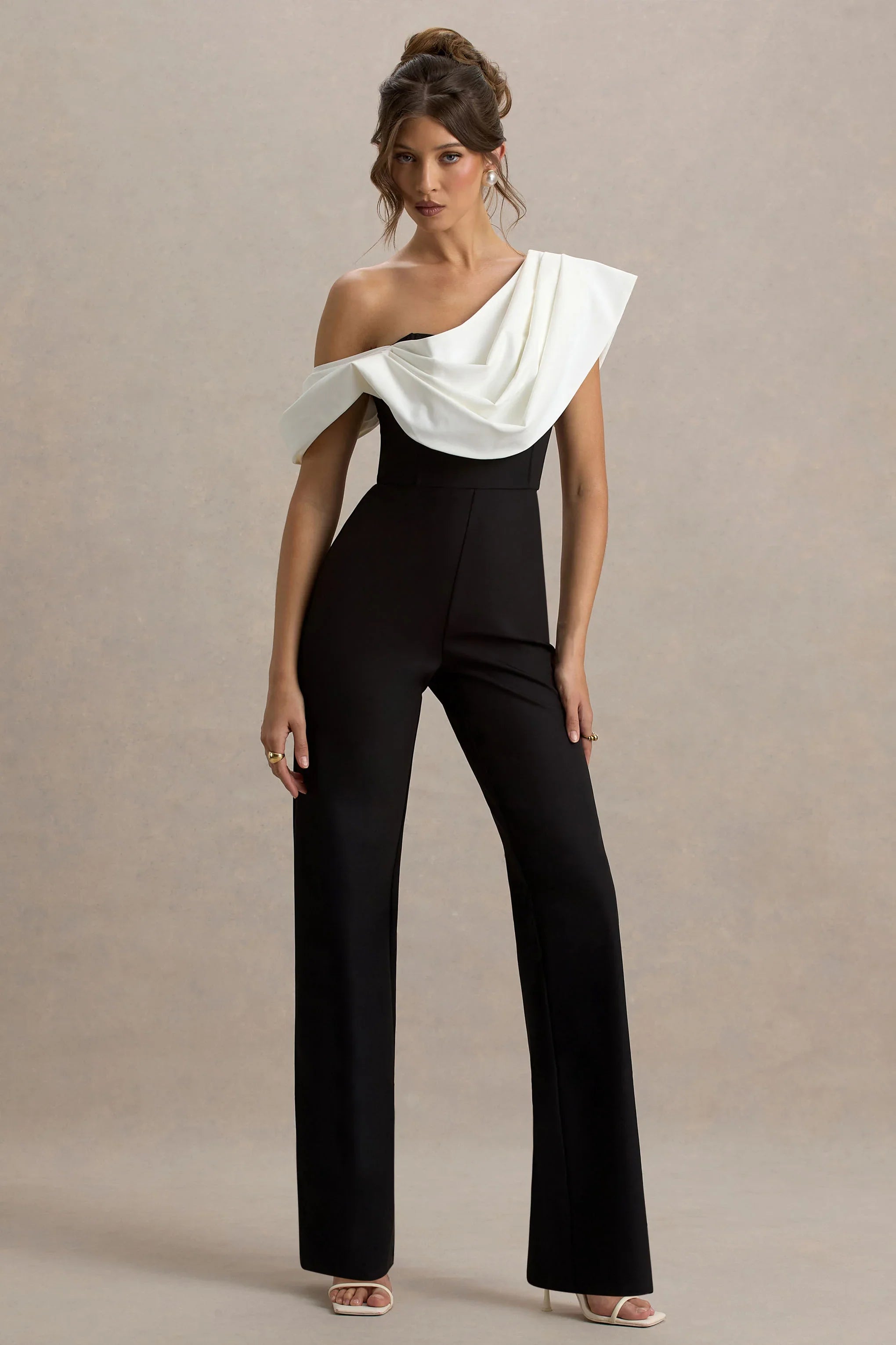 Strut with confidence in out Falling For You jumpsuit. Curated in a striking black and white contrast of our premium stretch crepe, this piece will flatter your figure like no other. Finished with a delicate, asymmetric drape detail that a romantic edge to this sleek piece. Style with heels and statement jewellery for your next dressed up occasion.
