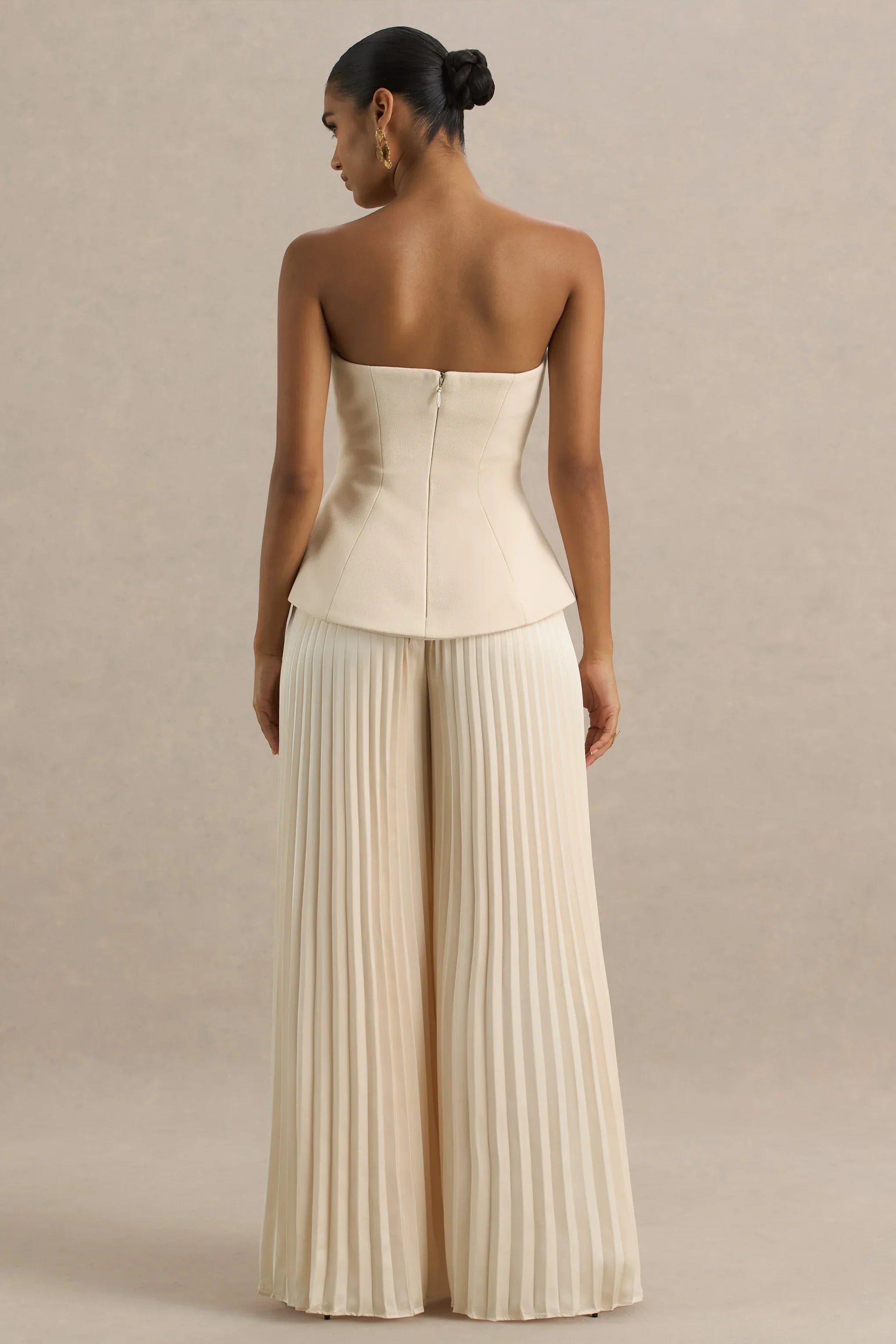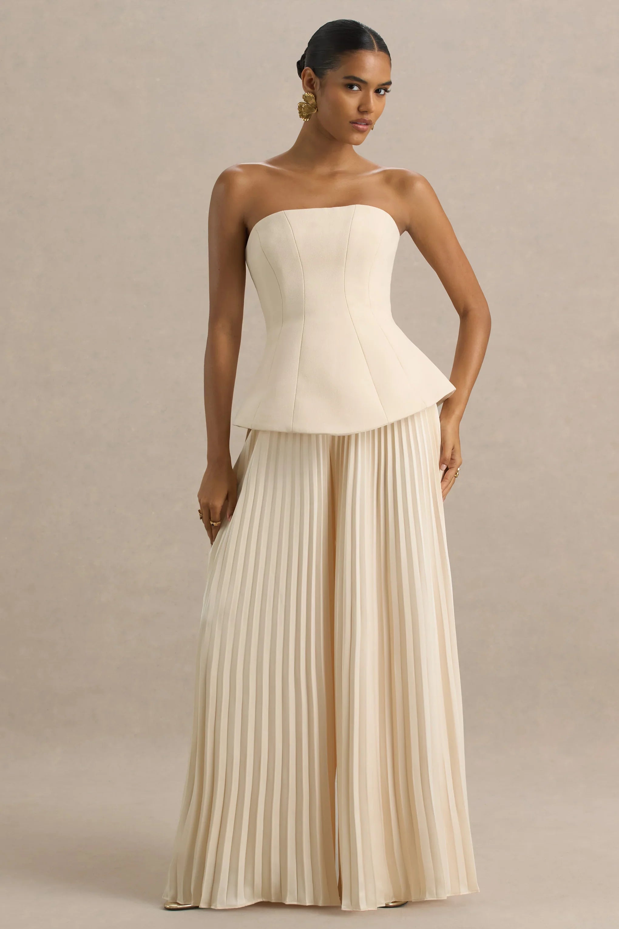 Own the room at your next dressed up occasion in Feeling Good , a sleek and sculpting piece made to command attention. Cut from our premium bonded scuba crepe in a rich nude hue, this statement jumpsuit exudes elegance. The classic bandeau neckline and a structured corseted bodice cinch you in flawlessly, ensuring you are flattered from all angles. The pleated trousers add tailored elegance and gorgeous movement with every step. From date nights to black tie events, In Feeling Good you won't be forgotten.