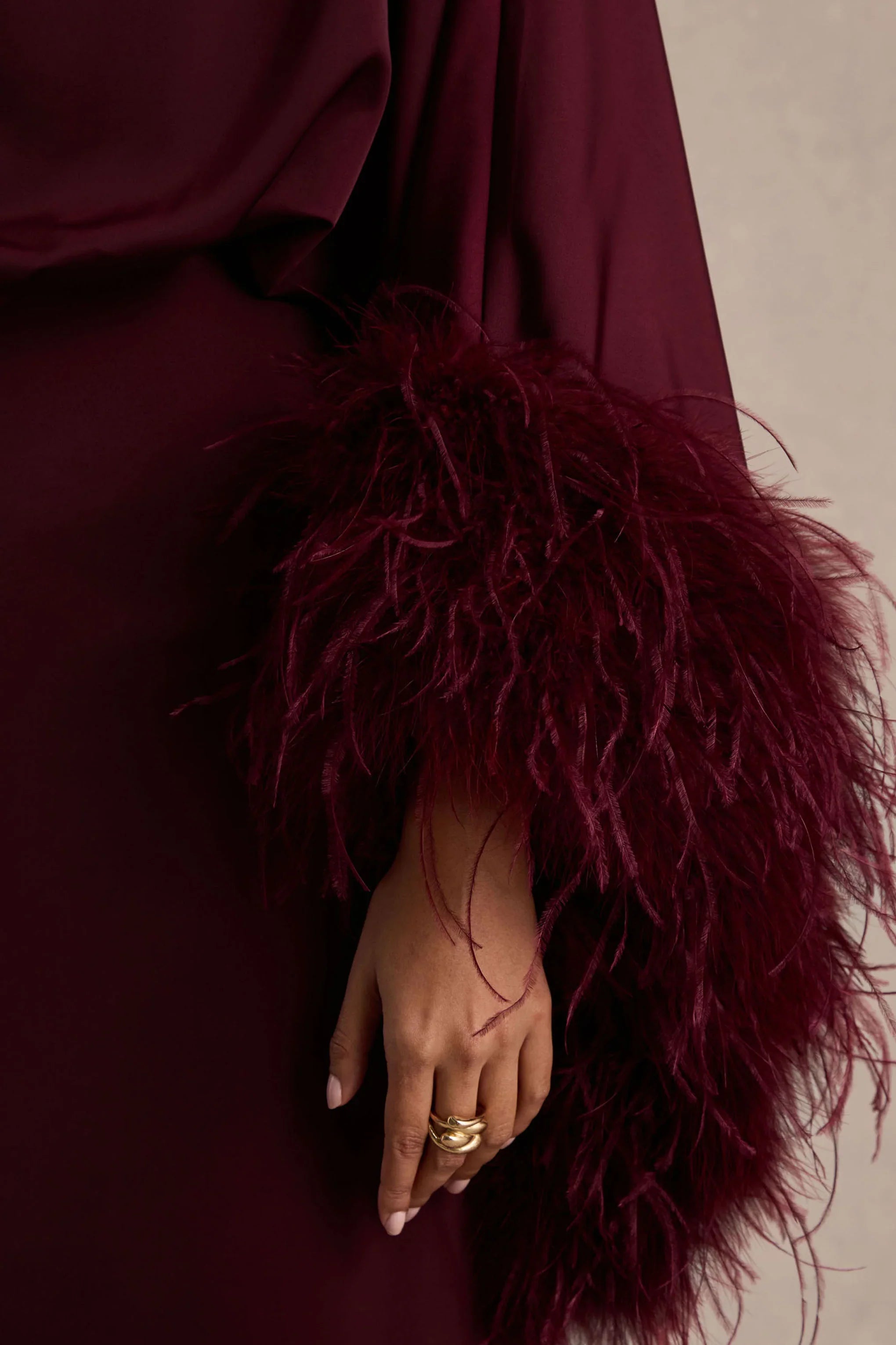 Command attention from every angle in Felicity. Crafted in our burgundy premium satin, this maxi dress exudes elegance with an edge. The asymmetric neckline and blouson bodice sculpt a sophisticated silhouette, while the statement feather trim at the sleeves adds a touch of high-glam drama. Designed to flow with your every move, Felicity features a centre-back split for ease and allure. Whether it’s a black-tie affair or a red-carpet moment, this showstopper promises unforgettable entrances.