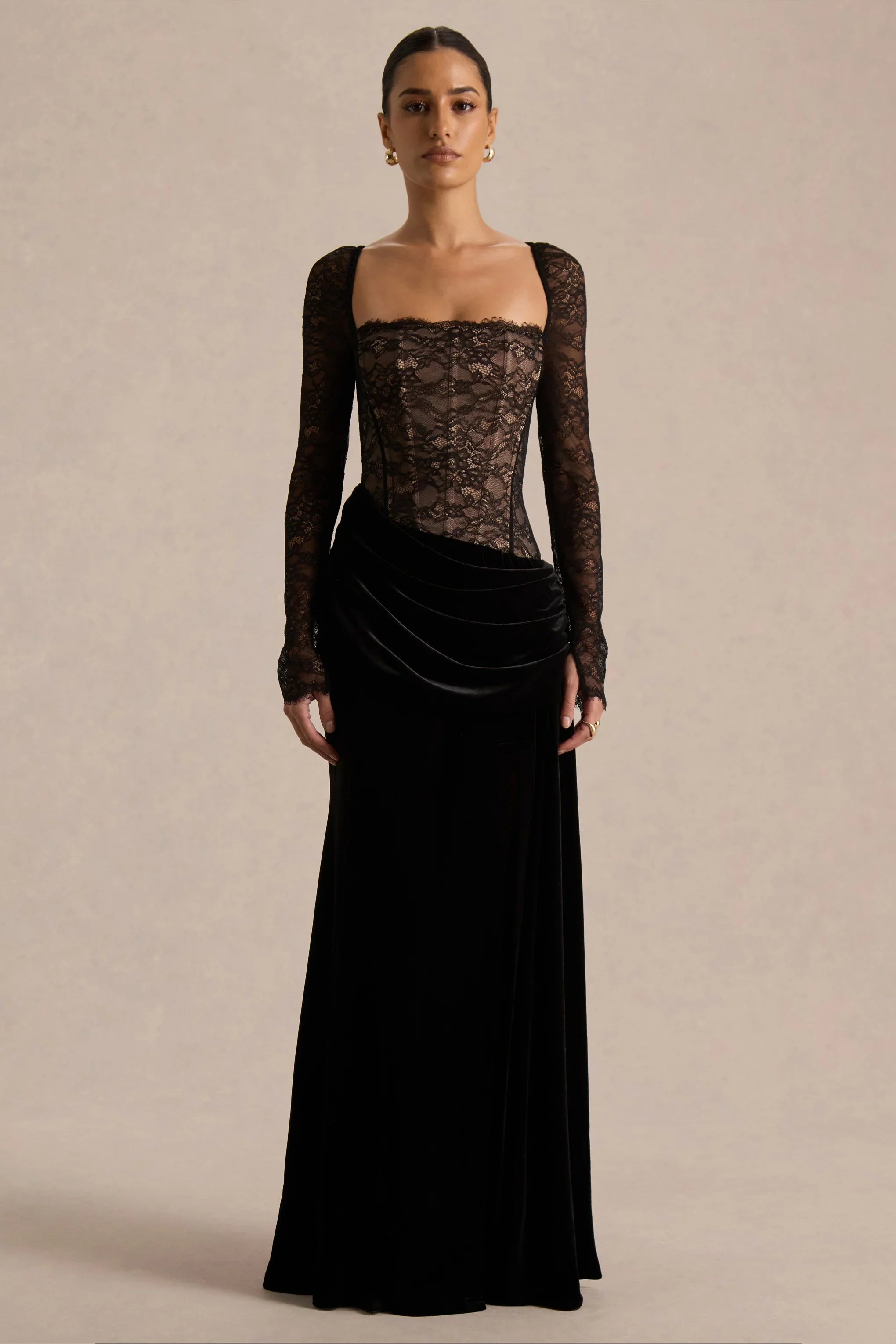 Finesse blends romantic detailing with a touch of dramatic sophistication. Designed with our premium lace bodice and a luxurious velvet skirt in timeless black, this maxi-length silhouette is both striking and elegant. The square neckline offers a refined, flattering frame, while the draped detailing adds soft movement throughout. Finished with a daring front high-split, Finesse is made for evenings that call for confidence, allure, and unforgettable style.