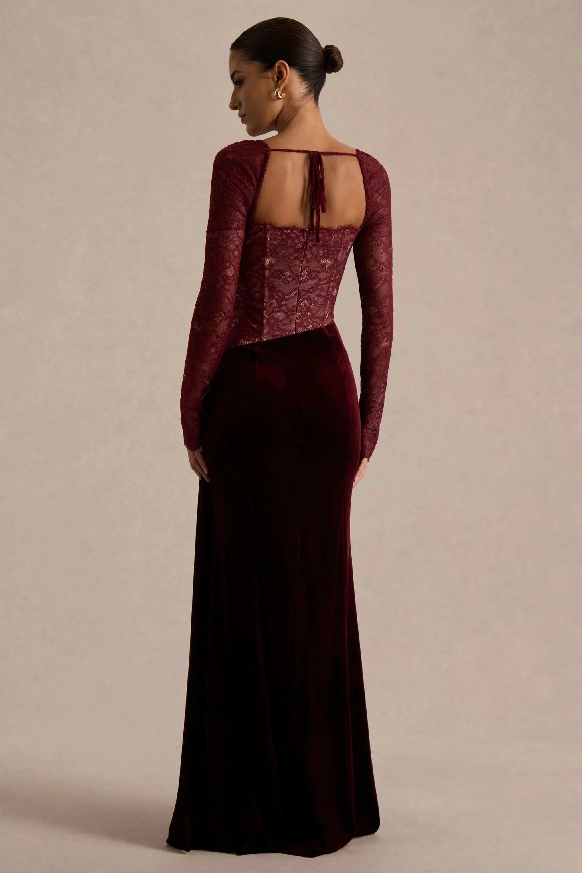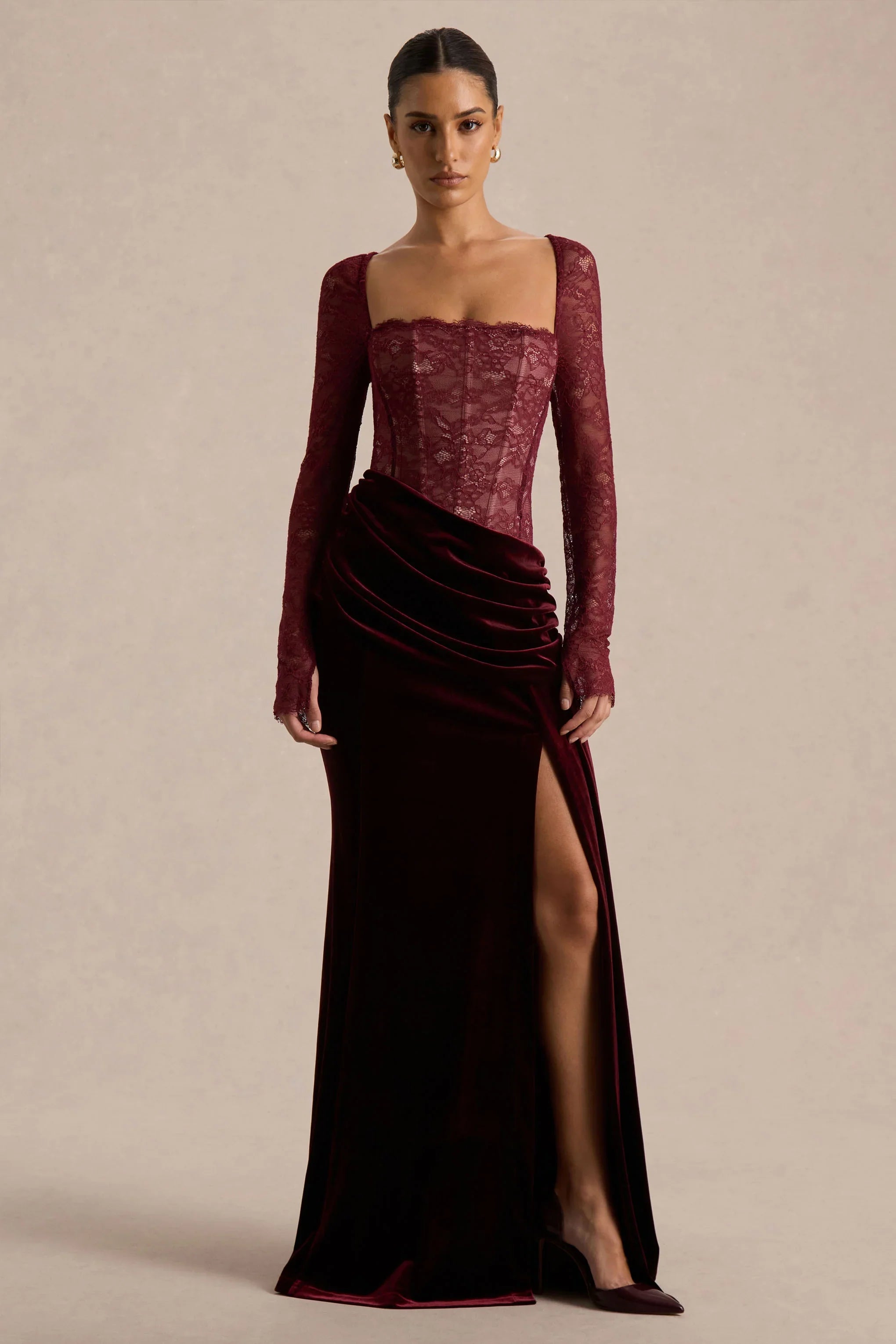 Finesse blends romantic detailing with a touch of dramatic sophistication. Designed with our premium lace bodice and a luxurious velvet skirt in timeless burgundy, this maxi-length silhouette is both striking and elegant. The square neckline offers a refined, flattering frame, while the draped detailing adds soft movement throughout. Finished with a daring front high-split, Finesse is made for evenings that call for confidence, allure, and unforgettable style.