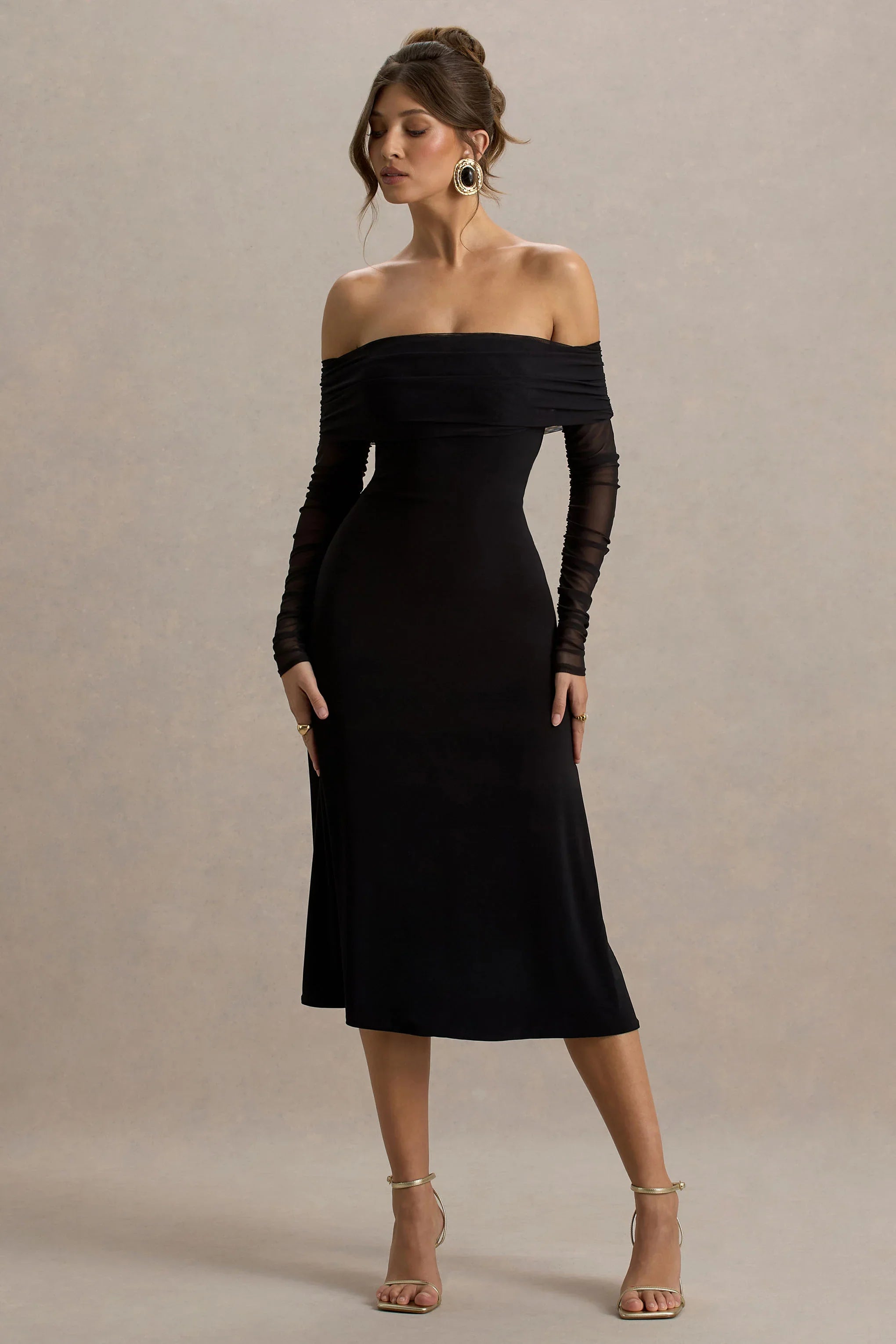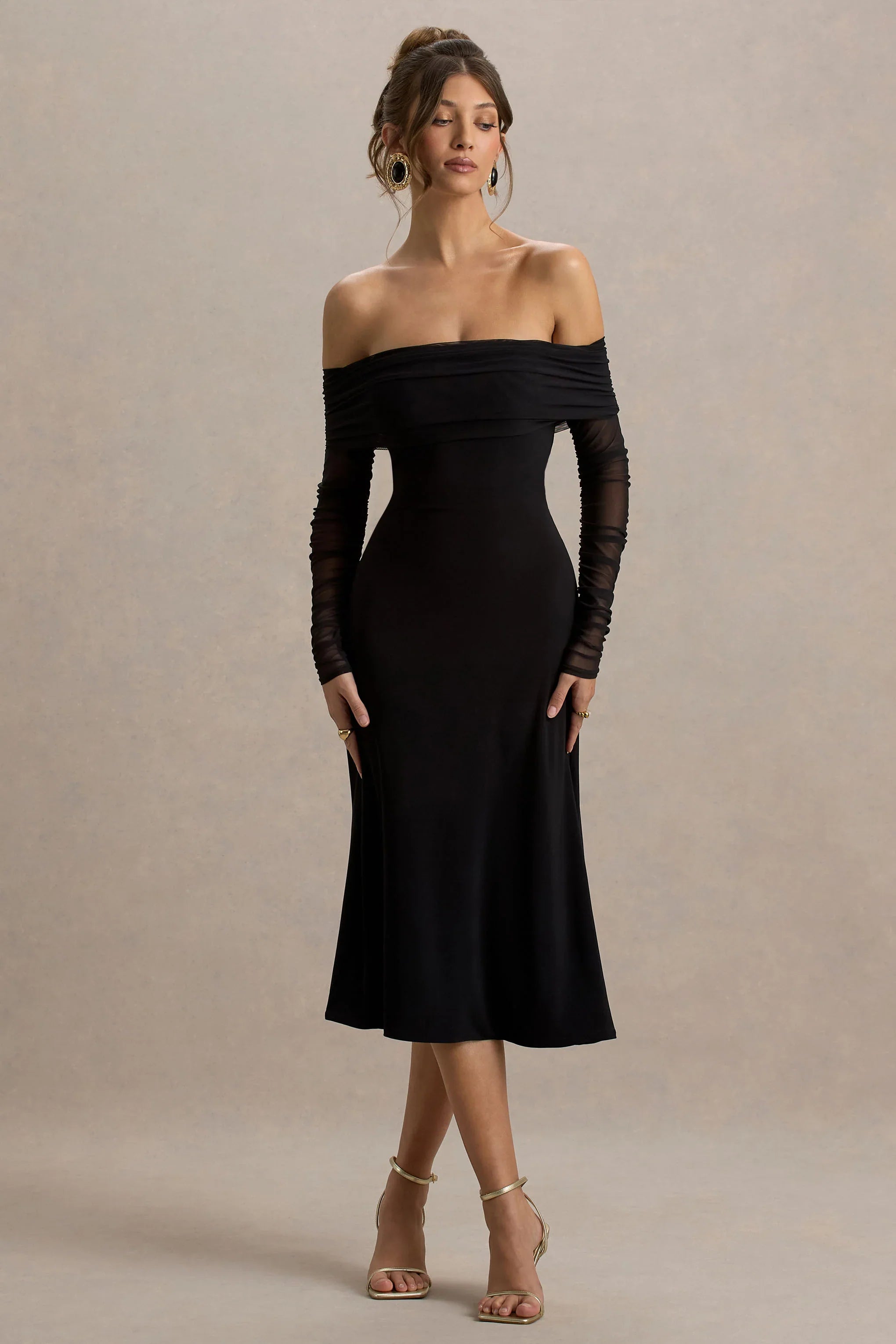 Introducing Flatter Me, the epitome of timeless, romantic elegance with a modern edge. Crafted in a rich black hue of our premium stretch jersey that skims over your figure for a flattering finish, and delicate mesh long sleeves for a touch of allure. The bardot neckline frames the shoulders whilst delicately displaying the decolletage, bringing an element of captivating charm and lure. Designed to make you feel utterly flawless from every angle, from date nights to black tie events in this piece you will be a vision of grace.