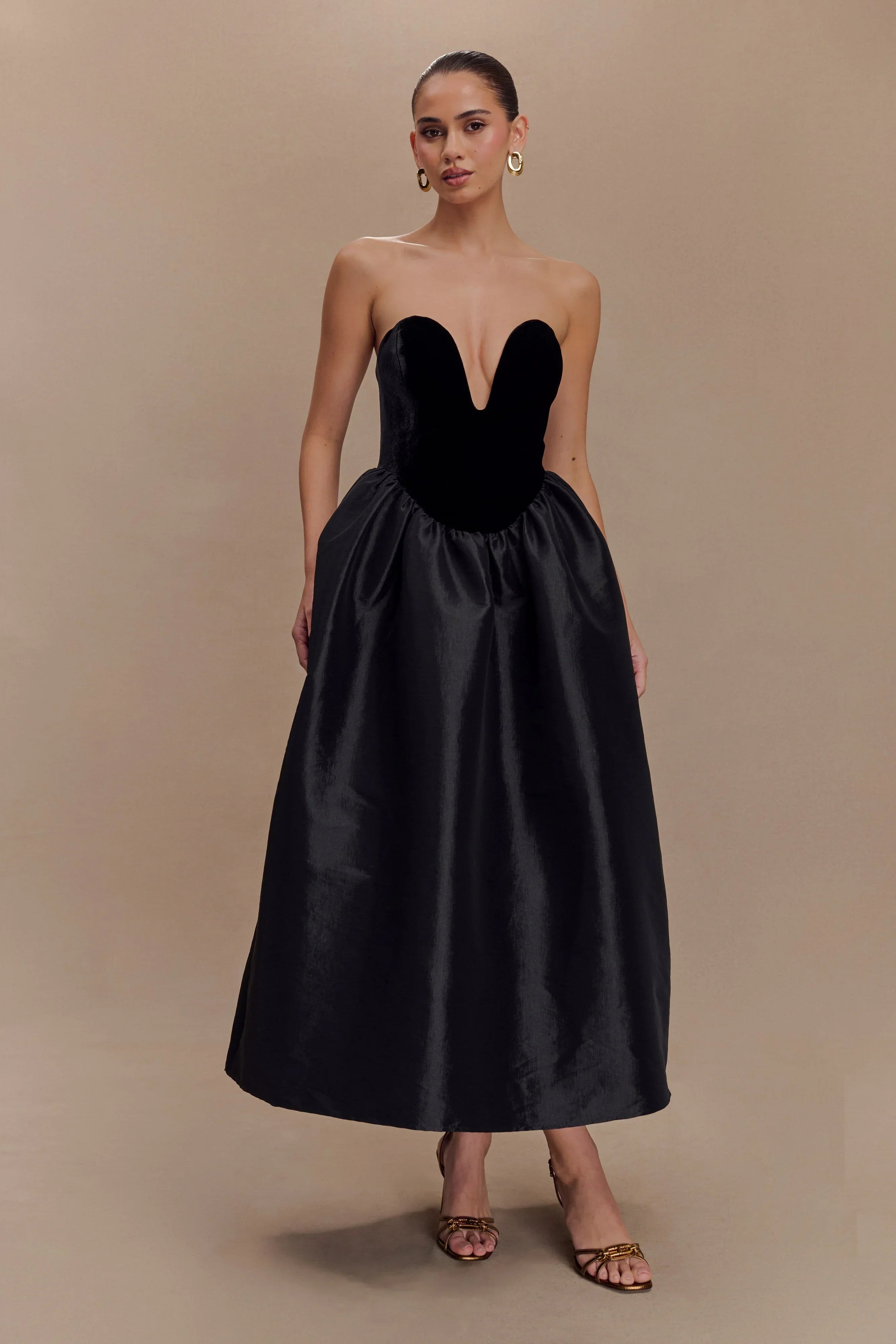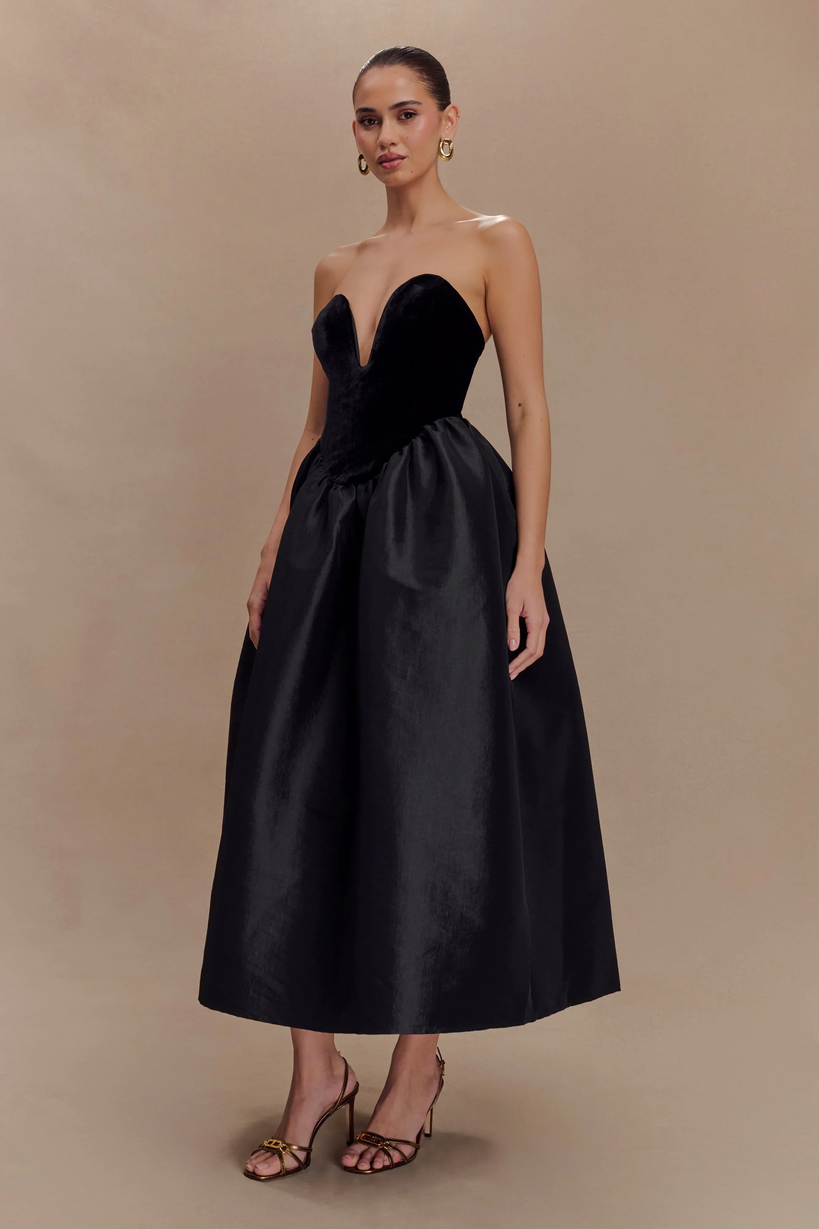 Step into elegance with the FLORA Strapless Velvet Midi Dress—a sophisticated choice for special evenings. This dress features a strapless, deep neckline and a structured velvet bodice that enhances your silhouette. The gathered full skirt flows gracefully, creating a romantic, feminine shape that’s both timeless and chic. Finished with a discreet centre back zip for ease, this dress combines luxurious texture with refined design, making it perfect for any occasion that calls for a touch of glamour.