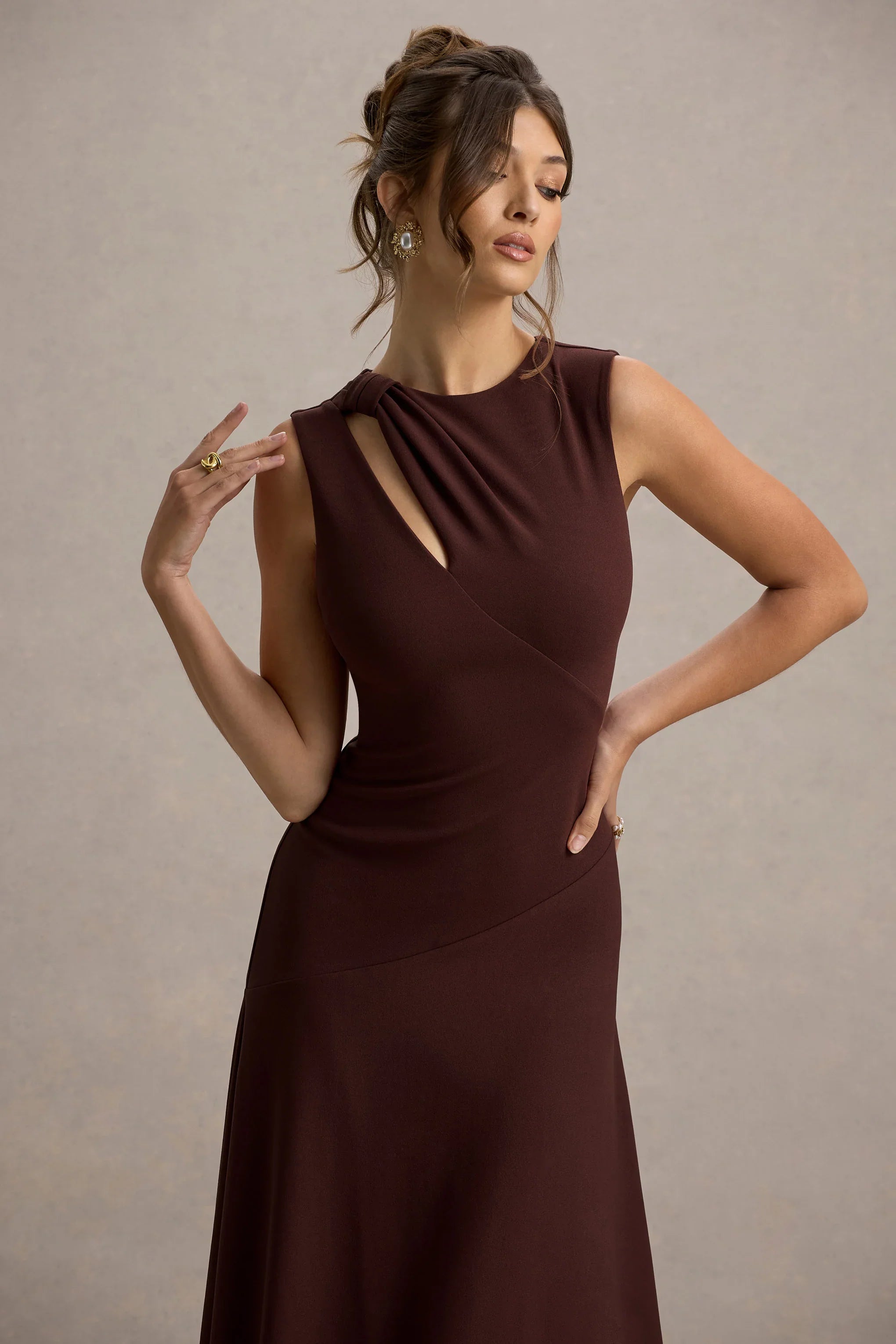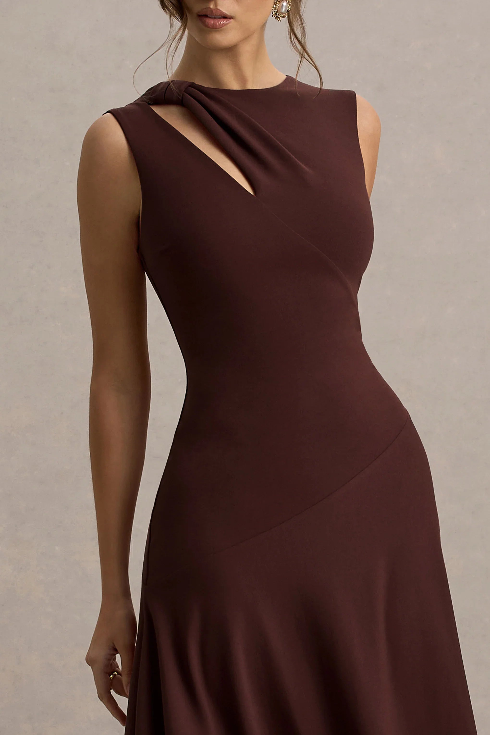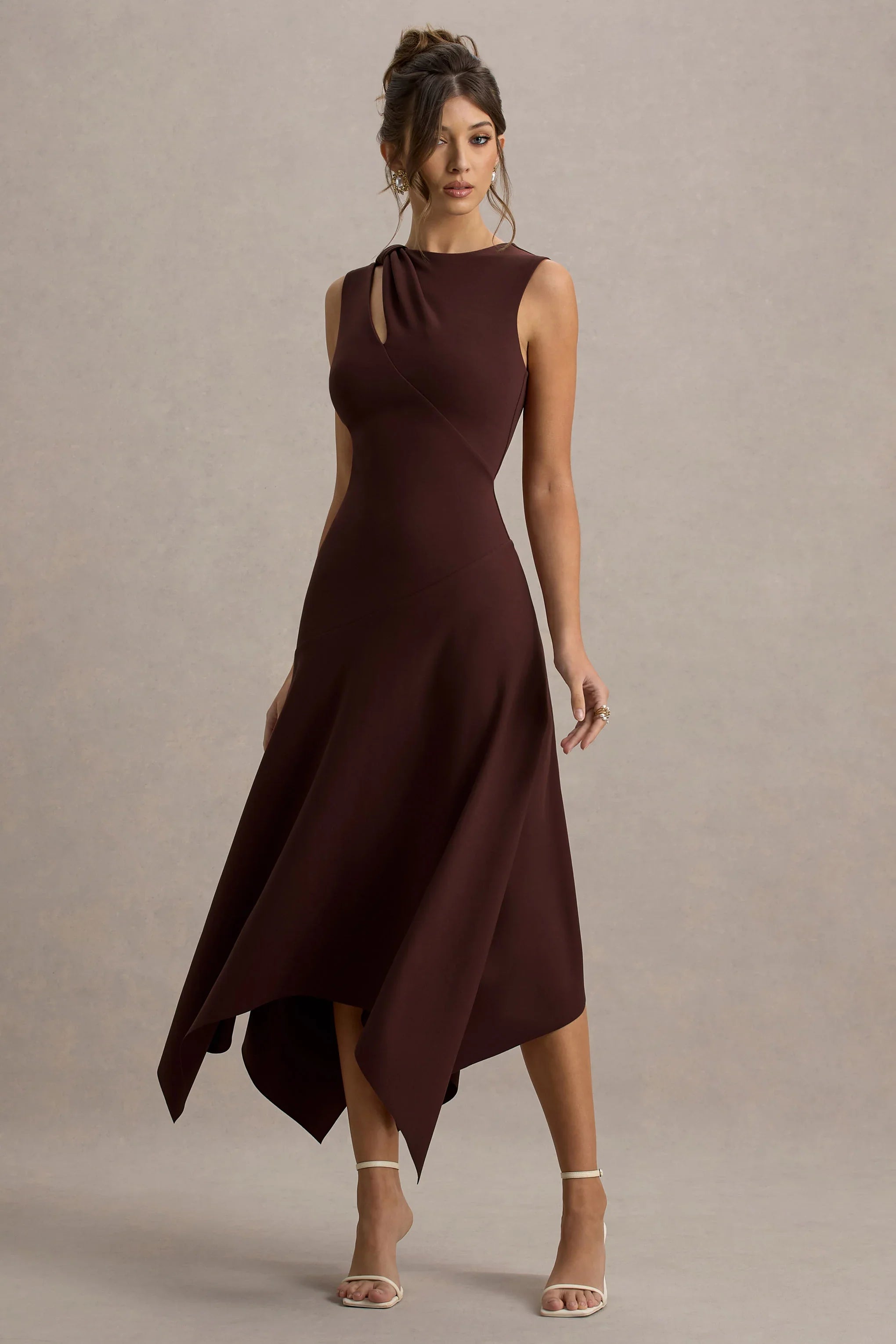 Turn heads at your next evening affair with our brown midi Francesca. Designed in our premium scuba crepe, this piece features a free-flowing silhouette adorned with an exquisite handkerchief hemline. The knot detail at the neckline adds a twist of modern edge to this elegant midi. Perfect for any event, from dinner dates to graduations.